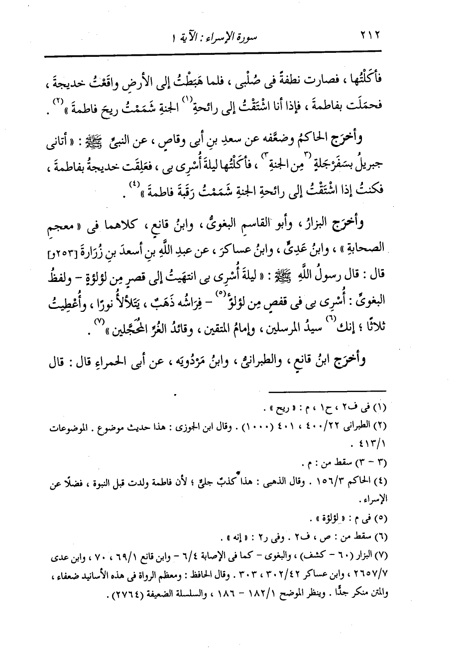 وأخرج الحاكم وضعفه عن سعد بن أبي وقاص رضي اله عنه عن النَّبِيّ صلى الله عليه وسلم : أتاني جبريل عليه السلام بسفرجلة فأكلتها ليلة أسري بي فعلقت خديجة بفاطمة فكنت إذا اشتقت إلى رائحة الجنة شممت رقبة فاطمة.