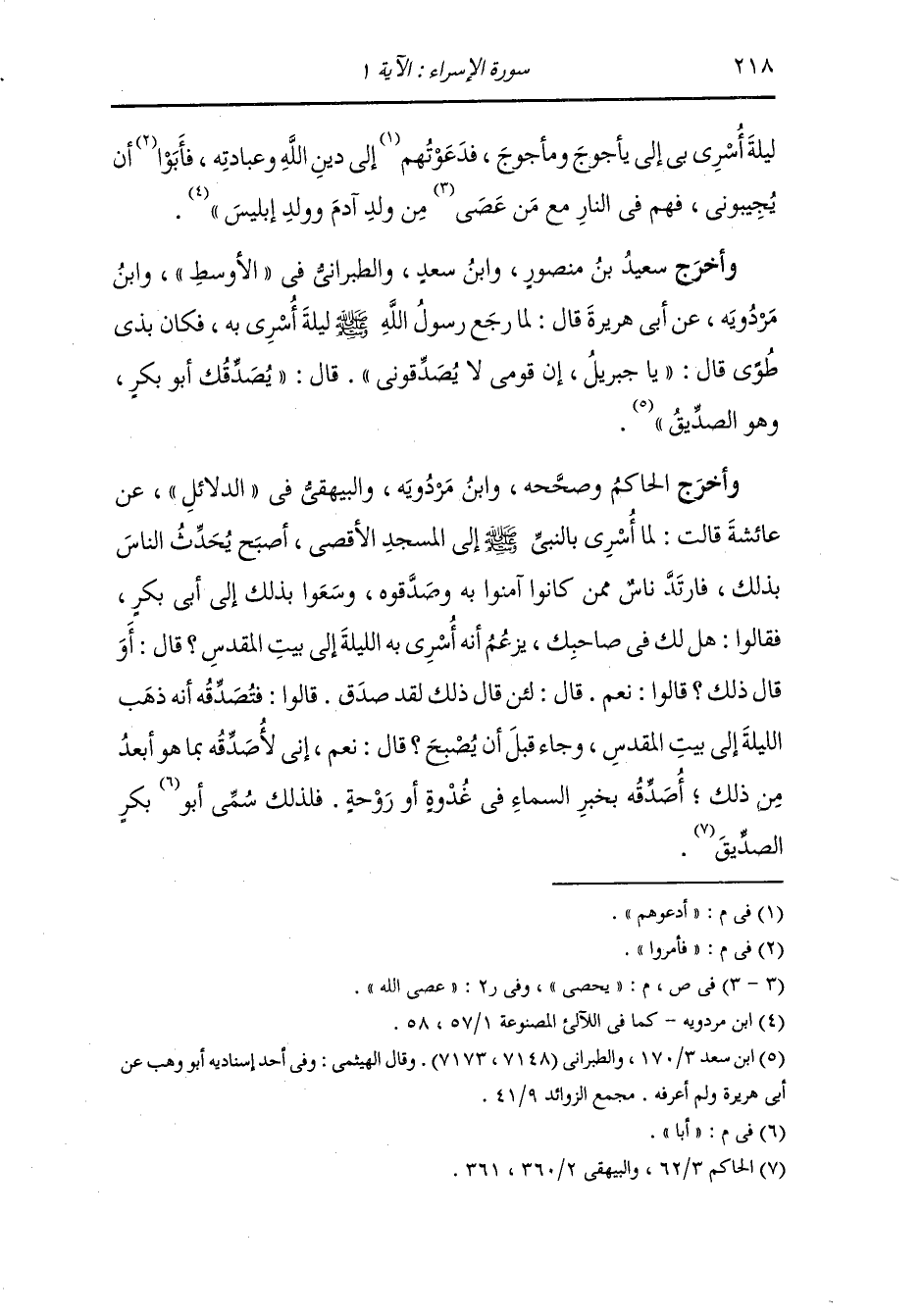 وأخرج الحاكم وصححه ، وَابن مردويه والبيهقي في الدلائل عن عائشة رضي الله عنها قالت : لما أسري بالنبي صلى الله عليه وسلم إلى المسجد الأقصى أصبح يحدث الناس بذلك فارتد ناس ممن كانوا آمنوا به وصدقوه وسعوا بذلك إلى أبي بكر رضي الله عنه فقالوا : هل لك في صاحبك يزعم أنه أسري به الليلة إلى بيت المقدس ، قال : أو قال ذلك قالوا : نعم ، قال : لئن قال ذلك لقد صدق ، قالوا : فتصدقه أنه ذهب الليلة إلى بيت المقدس وجاء قبل أن يصبح قال : نعم ، إني لأصدقه بما هو أبعد من ذلك أصدقه بخبر السماء في غدوة أو روحة ، فلذلك سمي أبا بكر الصديق.