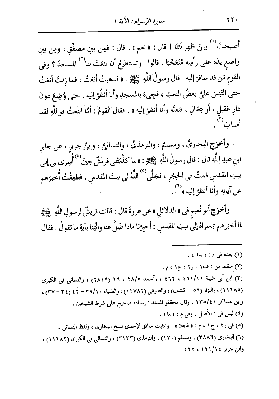 وأخرج البخاري ومسلم والترمذي والنسائي ، وَابن جَرِير ، عَن جَابر بن عبد الله رضي الله عنه قال : قال رسول الله صلى الله عليه وسلم : لما كذبتني قريش لما أسري بي إلى بيت المقدس قمت في الحجر فجلا الله لي بيت المقدس فطفقت أخبرهم عن آياته وأنا أنظر إليه.