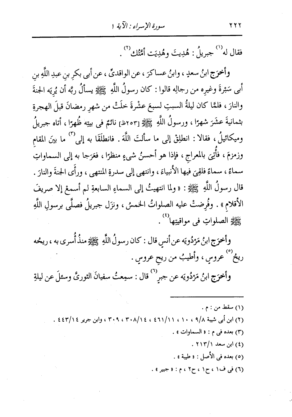 وأخرج ابن سعد ، وَابن عساكر عن الواقدي عن أبي بكر بن عبد الله بن أبي سبرة وغيره من رجاله قالوا : كان رسول الله يسأل ربه أن يريه الجنة والنار فلما كان ليلة السبت لسبع عشرة خلت من رمضان قبل الهجرة بثمانية عشر شهرا ورسول الله صلى الله عليه وسلم نائم في بيته ظهرا أتاه جبريل وميكائيل فقالا : انطلق إلى ما سألت الله فانطلقا به إلى السموات ما بين المقام وزمزم فأتي بالمعراج فإذا هو أحسن شيء منظرا فعرج به إلى السموات سماء سماء فلقي فيها الأنبياء وانتهى إلى سدرة المنتهى ورأى الجنة والنار ، قال رسول الله صلى الله عليه وسلم : ولما انتهيت إلى السماء السابعة لم أسمع إلا
