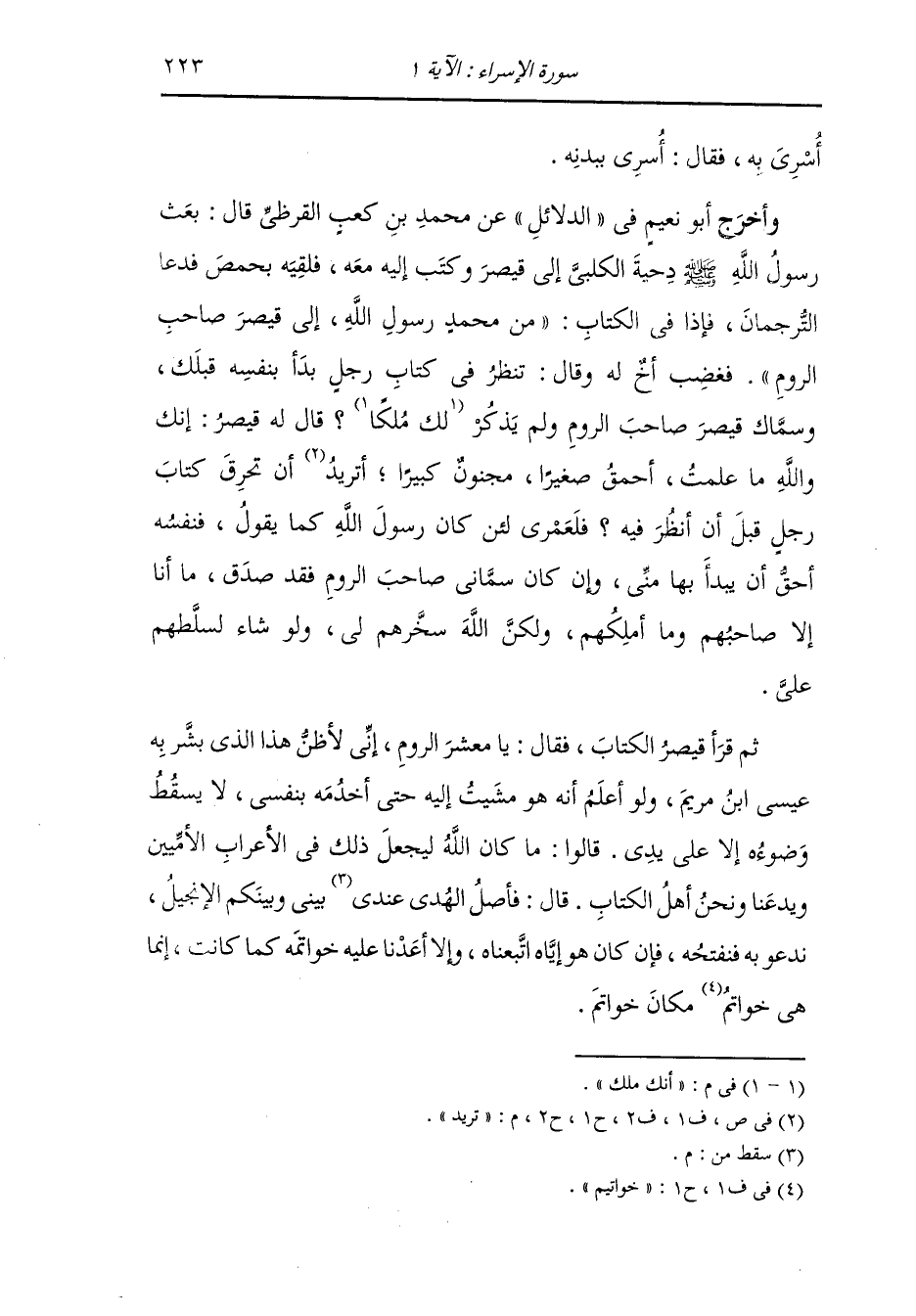 وأخرج أبو نعيم في الدلائل عن محمد بن كعب القرظي رضي الله عنه قال : بعث رسول الله صلى الله عليه وسلم دحية الكلبي رضي الله عنه إلى قيصر وكتب إلبه معه فلقيه بحمص ودعا الترجمان فإذا في الكتاب من محمد رسول الله إلى قيصر صاحب الروم فغضب أخ له وقال : تنظر في كتاب رجل بدأ بنفسه قبلك وسماك قيصر صاحب الروم ولم يذكر أنك ملك قال له قيصر : إنك والله ما علمت أحمق صغيرا مجنونا كبيرا : تريد أن تحرق كتاب رجل قبل أن أنظر فيه فلعمري لئن كان رسول الله كما يقول : فنفسه أحق أن يبدأ بها مني وإن كان سماني صاحب الروم فلقد صدق ما أنا إلا صاحبهم وما أملكهم ولكن الله سخرهم لي ولو شاء لسلطهم علي ، ثم قرأ قيصر الكتاب فقال : يا معشر الروم إني لأظن هذا الذي بشر به عيسى ابن مريم ولو أعلم أنه هو مشيت إليه حتى أخدمه بنفسي لا يسقط وضوءه إلا على يدي ، قالوا : ما كان الله ليجعل ذلك في الأعراب الأميين ويدعنا ونحن أهل الكتاب ، قال : فاصل الهدى بيني وبينكم الإنجيل ندعو به فنفتحه فإن كان هو إياه اتبعناه وإلا أعدنا عليه خواتمه كما كانت إنما هي خواتيم مكان خواتم.
