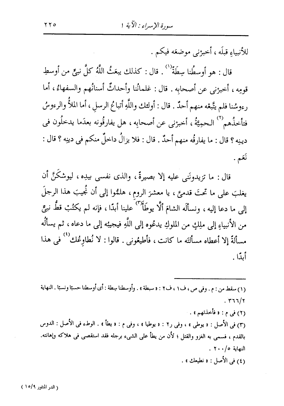للأنبياء عليهم السلام قبله ، قال : أخبرني عن موضعه فيكم ، قال : هو أوسطنا ، قال : كذلك بعث الله كل نبي من أوسط قومه ، أخبرني عن أصحابه ، قال : غلماننا وأحداث أسنانهم والسفهاء أما رؤساؤنا فلم يتبعه منهم أحد ، قال : أولئك والله تباع الرسل أما الملأ والرؤوس فأخذتهم الحمية ، قال : أخبرني عن أصحابه هل يفارقونه بعدما يدخلون في دينه قال : ما يفارقه منهم أحد ، قال : فلا يزال داخل منكم في دينه قال : نعم ، قال : ما تزيدونني عليه إلا بصيرة والذي نفسي بيده ليوشكن أن يغلب على ما تحت قدمي ، يا معشر الروم هلموا إلى أن نجيب هذا الرجل إلى ما دعا إليه ونسأله الشام أن لا يطأ علينا أبدا ، فإنه لم يكتب قط نبي من الأنبياء إلى ملك من الملوك يدعوه إلى الله فيجيبه إلى ما دعاه ثم يسأله مسألة إلا أعطاه مسألته ما كانت فأطيعوني ، قالوا : لا نطاوعك في هذا أبدا.