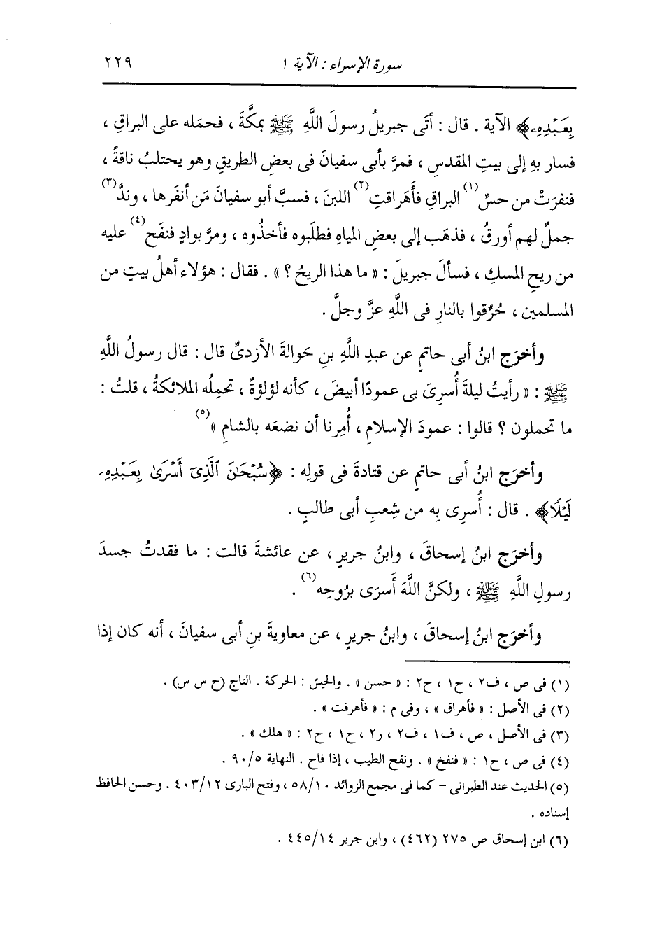 بعبده} الآية ، قال : أتى جبريل النَّبِيّ صلى الله عليه وسلم بمكة فحمله على البراق فسار به إلى بيت المقدس فمر بأبي سفيان في بعض الطريق وهو يحتلب ناقة فنفرت من حس البراق فأهرقت اللبن فسب أبو سفيان من نفرها وند جمل لهم أورق فذهب إلى بعض المياه فطلبوه فأخذوه ومر بواد فنفخ عليه من ريح المسك فسأل جبريل عليه السلام ما هذا الريح فقال : هؤلاء أهل بيت من المسلمين حرقوا بالنار في الله عز وجل.