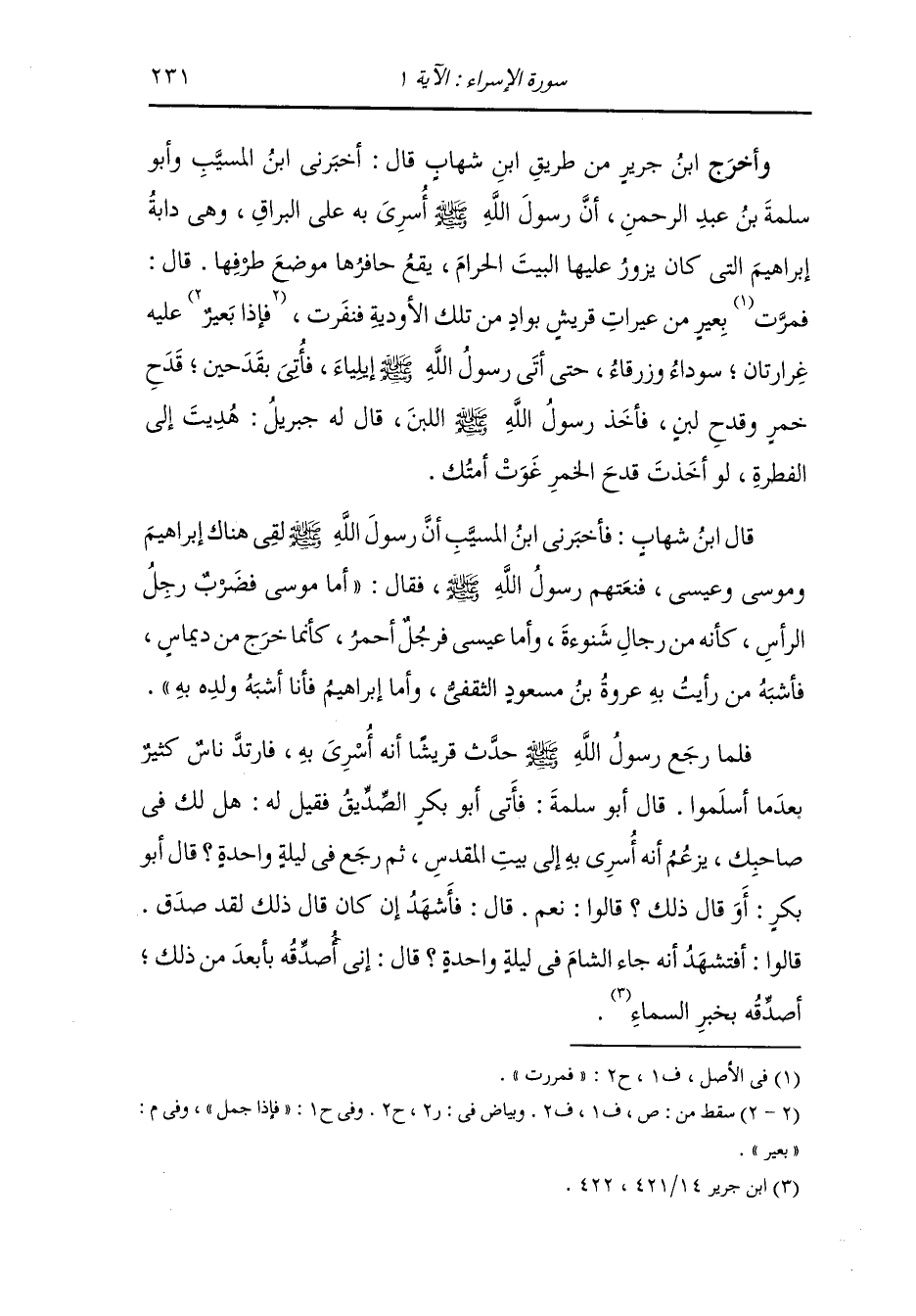 وأخرج ابن جرير من طريق ابن شهاب رضي الله عنه قال : أخبرني ابن المسيب وأبو سلمة بن عبد الرحمن أن رسول الله صلى الله عليه وسلم - أسري به على البراق - وهي دابة إبراهيم التي كان يزور عليها البيت الحرام يقع حافرها موضع طرفها ، قال : فمرت بعير من عيرات قريش - بواد من تلك الأودية فنفر بعير عليه غرارتان سوداء وزرقاء حتى أتى رسول الله صلى الله عليه وسلم إيليا فأتي بقدحين قدح خمر وقدح لبن فأخذ رسول الله صلى الله عليه وسلم اللبن ، قال له جبريل عليه السلام : هديت إلى الفطرة لو أخذت قدح الخمر غوت أمتك ، قال ابن شهاب رضي الله عنه : فأخبرني ابن المسيب أن رسول الله صلى الله عليه وسلم لقي هناك إبراهيم وموسى وعيسى فنعتهم رسول الله صلى الله عليه وسلم فقال : أما موسى فضرب رجل الرأس كأنه من رجال شنوأة وأما عيسى فرجل أحمر كأنما خرج من ديماس فأشبه من رأيت به عروة بن مسعود الثقفي وأما إبراهيم فأنا أشبه ولده به ، فلما رجع رسول الله حدث قريشا أنه أسري به فارتد ناس كثير بعدما أسلموا ، قال أبو سلمة : فأتى أبو بكر الصديق رضي الله عنه - فقيل له : هل لك في صاحبك يزعم أنه أسري به إلى بيت المقدس ثم رجع في ليلة واحدة ، قال أبو بكر رضي الله عنه : أو قال ذلك قالوا : نعم ، قال : فأشهد إن كان قال ذلك لقد صدق ، قالوا : أفتشهد أنه جاء الشام في ليلة واحدة قال : إني أصدقه بأبعد من ذلك أصدقه بخبر السماء.