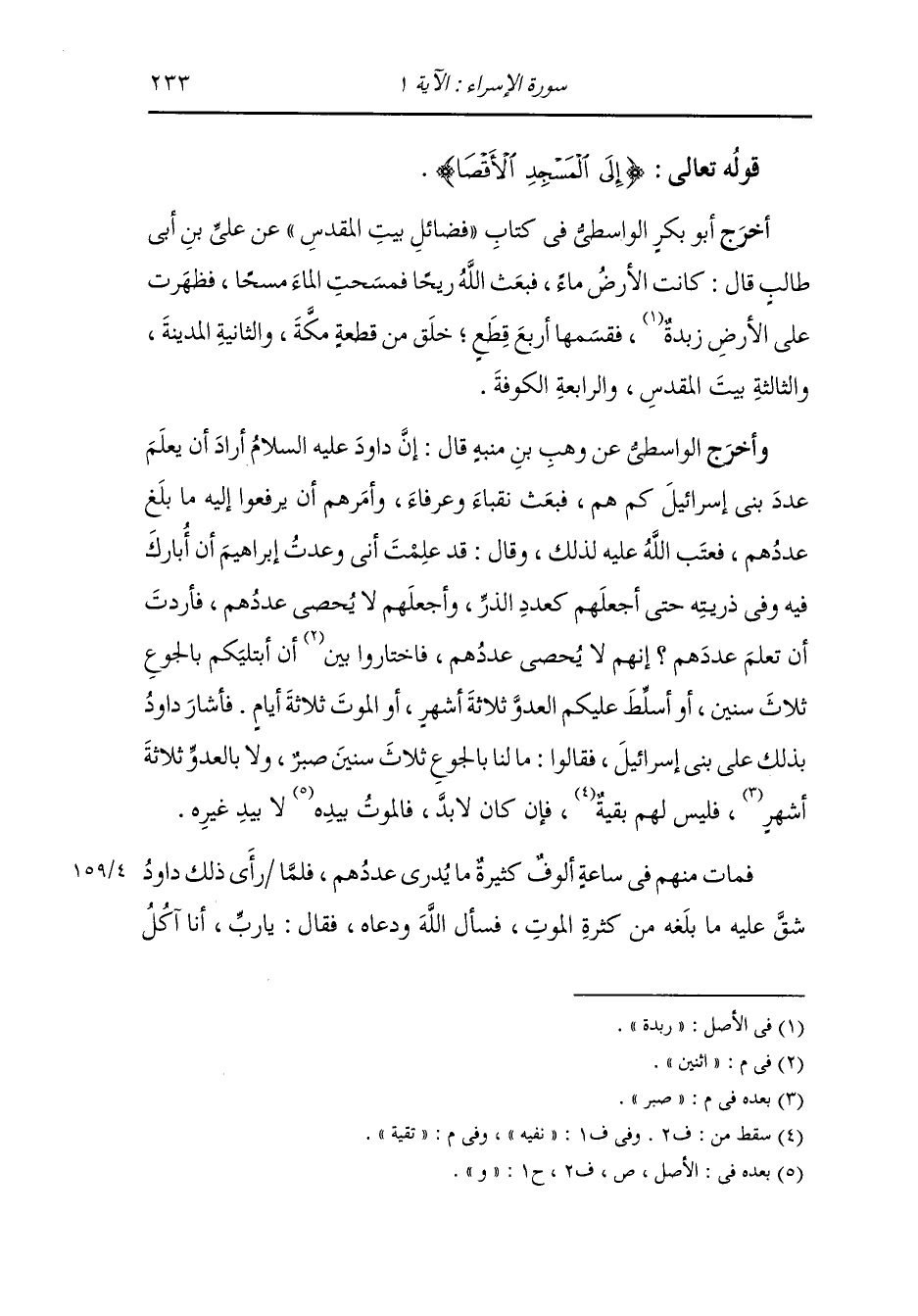 وأخرج أبو بكر الواسطي في كتاب فضائل بيت المقدس عن علي بن أبي طالب رضي الله عنه قال : كانت الأرض ماء فبعث الله تعالى ريحا فمسحت الماء مسحا فظهرت الأرض زبدة فقسمها أربع قطع : خلق من قطعة مكة والثانية مكة والثالثة بيت المقدس والرابعة الكوفة ، وقال الواسطي رضي الله عنه عن وهب بن منبه رضي الله عنه قال : أن داود عليه السلام أراد أن يعلم عدد بني إسرائيل كم هم فبعث نقباء وعرفاء وأمرهم أن يرفعوا إليه ما بلغ عددهم فعتب الله عليه لذلك وقال : قد علمت أني وعدت إبراهيم أن أبارك فيه وفي ذريته حتى أجعلهم كعدد الذر وأجعلهم لا يحصى عددهم وأردت أن تعلم عددهم إنه لا يحصى عددهم فاختاروا اثنين أن أبتليكم بالجوع ثلاث سنين أو أسلط عليكم العدو ثلاثة أشهر أو الموت ثلاثة أيام فأشار بذلك داود عليه السلام على بني إسرائيل فقالوا ما لنا بالجوع ثلاث سنين صبر ولا بالعدو ثلاثة أشهر صبر فليس لهم تقية فإن كان لا بد فالموت بيده لا بيده غيره ، فمات منهم في ساعة ألوف كثيرة ما يدرى عددهم فلما رأى ذلك داود عليه السلام شق عليه ما بلغه من كثرة الموت فسأل الله ودعا فقال : يا رب أنا آكل