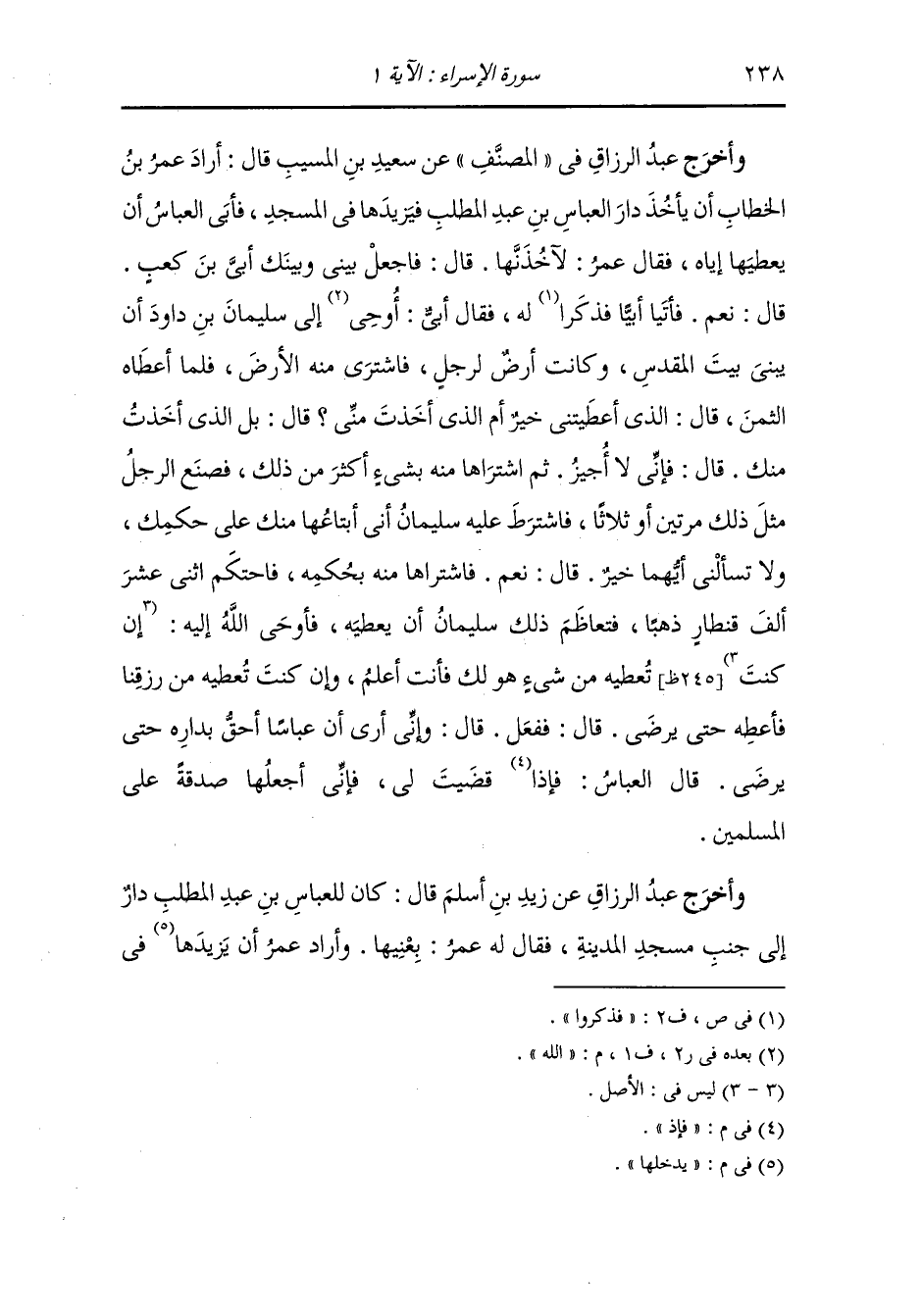 أراد عمر بن الخطاب رضي الله عنه أن يأخذ دار العباس بن عبد المطلب ليزيد بها في المسجد فأبى العباس رضي الله عنه أن يعطيها إياه ، فقال عمر رضي الله عنه لآخذنها ، قال : فاجعل بيني وبينك أبي بن كعب ، قال : نعم فأتيا أبيا فذكرا له فقال أبي رضي الله عنه : أوحى الله إلى سليمان بن داود عليه السلام أن يبني بيت المقدس وكانت أرض لرجل فاشترى منه الأرض فلما أعطاه الثمن قال : الذي أعطيتني خير أم الذي أخذت مني قال : بل الذي أخذت منك ، قال : فإني لا أجيز ثم اشتراها منه بشيء أكثر من ذلك فصنع الرجل مثل ذلك مرتين أو ثلاثا فاشترط عليه سليمان عليه السلام : أني أبتاعها منك على حكمك ولا تسألني أيهما خير ، قال : نعم ، فاشتراها منه بحكمة فاحتكم اثني عشر ألف قنطار ذهبا فتعاظم ذلك سليمان أن يعطيه فأوحى الله إليه إن كنت تعطيه من شيء هو لك فأنت أعلم وإن كنت تعطيه من رزقنا فأعطه حتى يرضى ، قال : ففعل ، قال : وإني أرى أن عباسا رضي الله عنه أحق بداره حتى يرضى ، قال العباس رضي الله عنه : فإذ قضيت فإني أجعلها صدقة على المسلمين.