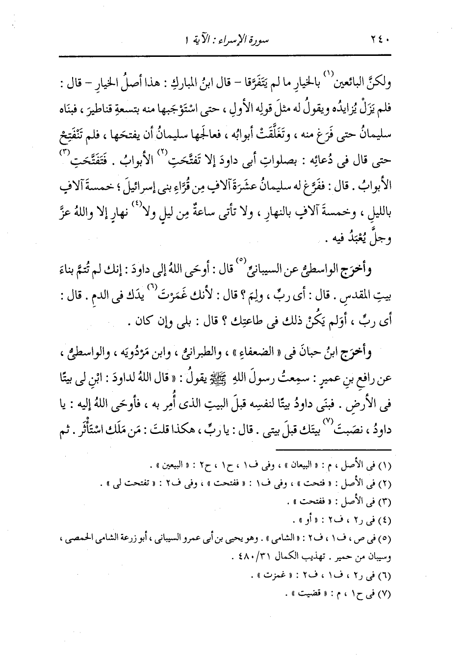 ولكن البيعان بالخيار ما لم يتفرقا ، قال ابن المبارك رضي الله عنه : هذا أصل الخيار ، فلم يزل يزايده ويقول مثل قوله الأول حتى استوجبتها منه بتسعة قناطير فبناه سليمان عليه السلام حتى فرغ منه وتغلقت أبوابها فعالجها سليمان عليه السلام أن يفتحها فلم تنفتح حتى قال في دعائه : بصلوات أبي داود إلا تفتحت الأبواب فتفتحت الأبواب ، قال : ففرغ له سليمان عليه السلام : عشرة آلاف من قراء بني إسرائيل خمسة آلاف بالليل وخمسة آلاف بالنهار ولا تأتي ساعة من ليل ولا نهار إلا الله عز وجل يعبد فيه.