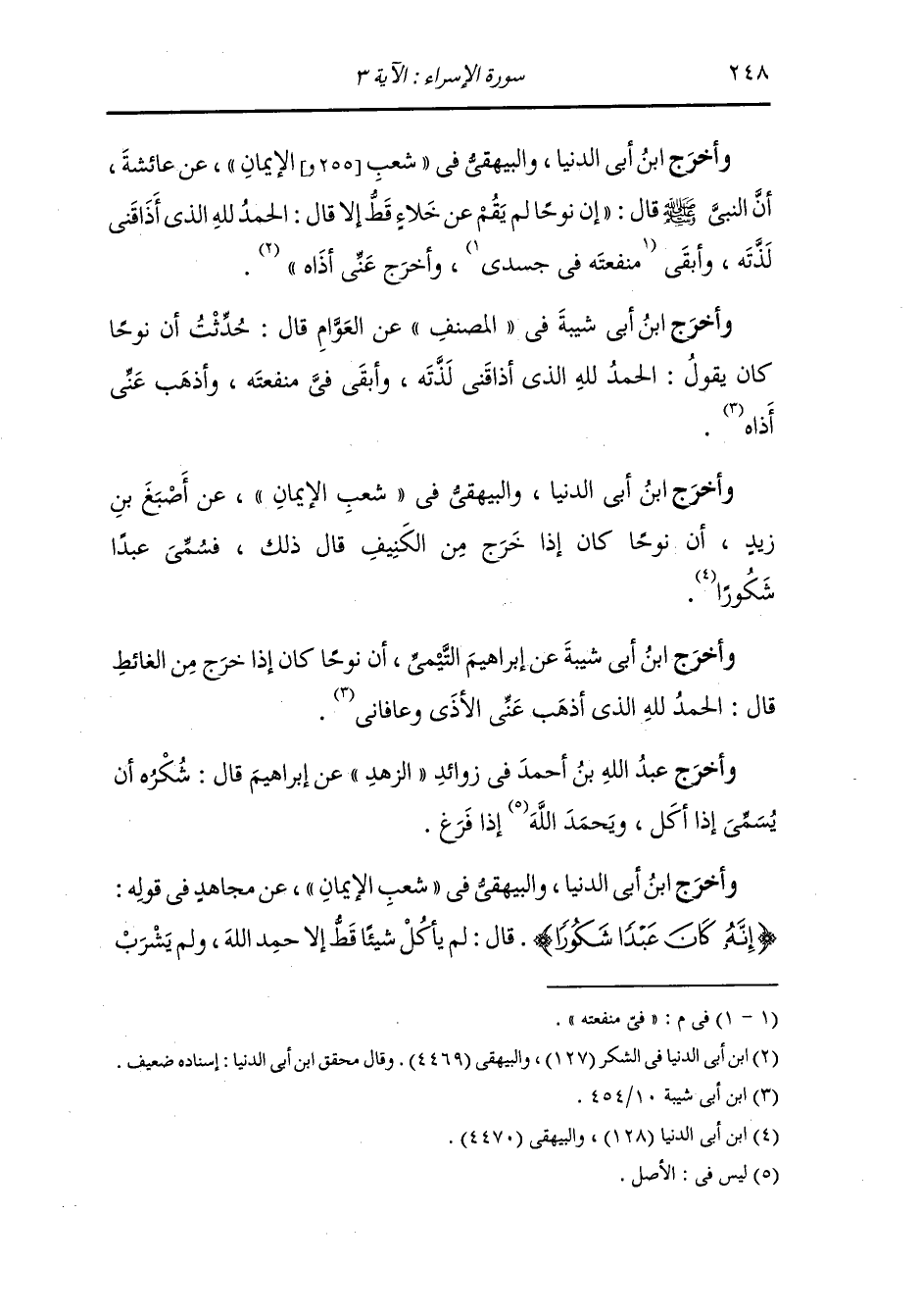 وأخرج ابن أبي الدنيا والبيهقي في شعب الإيمان عن مجاهد رضي الله عنه في قوله : {إنه كان عبدا شكورا} قال : لم يأكل شيئا قط إلا أحمد الله ولم يشرب