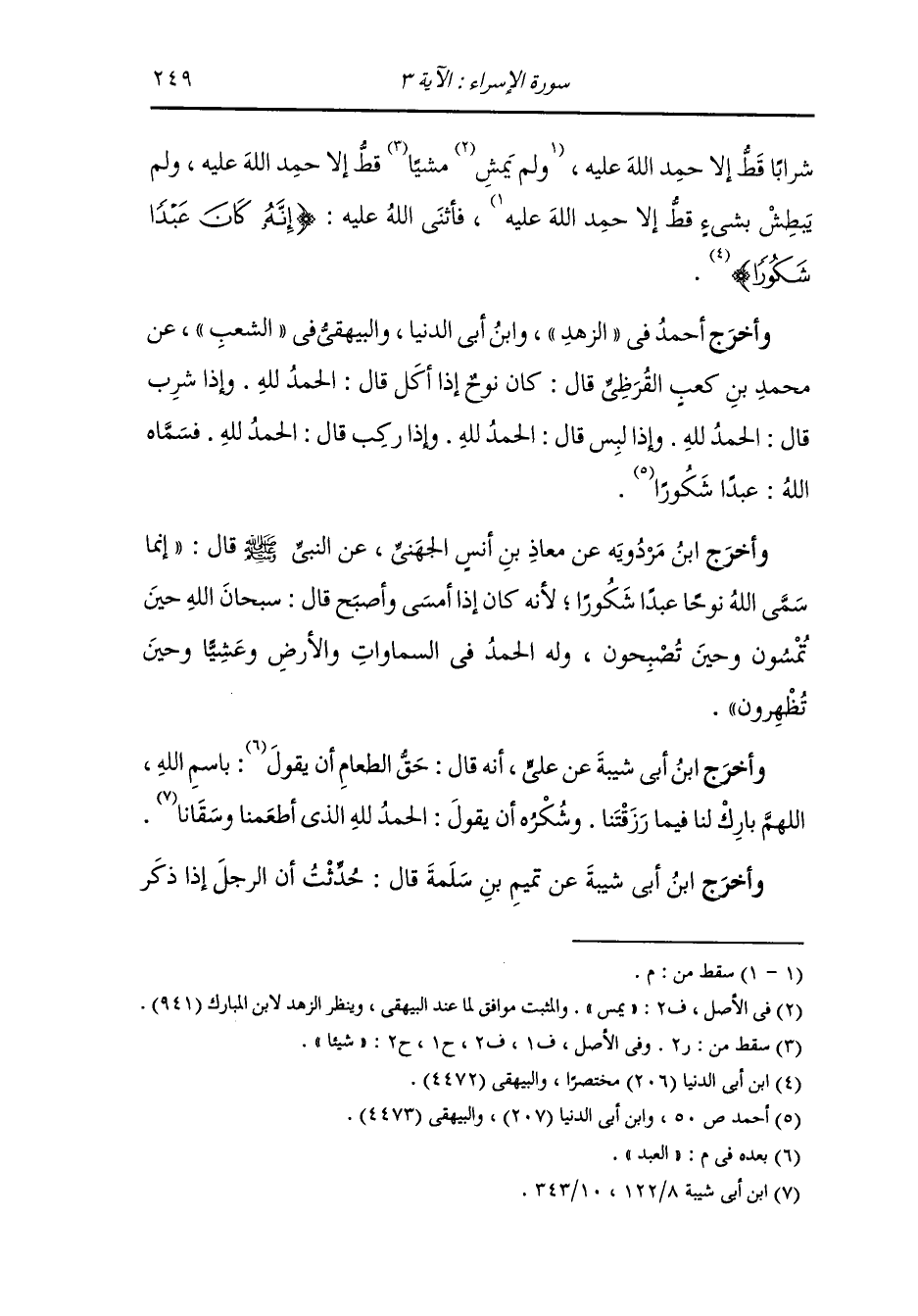 وأخرج أحمد في الزهد ، وَابن أبي الدنيا والبيهقي في الشعب عن محمد بن كعب القرظي رضي اله عنه قال : كان نوح عليه السلام إذا أكل قال : الحمد لله وإذا شرب قال : الحمد لله وإذا لبس قال : الحمد لله وإذا ركب قال : الحمد لله فسماه الله {عبدا شكورا}.