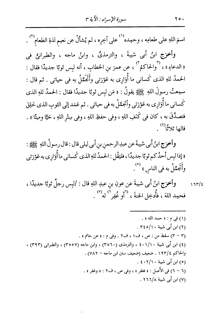وأخرج ابن أبي شيبة والترمذي ، وَابن ماجة والطبراني في الدعاء عن حاتم عن عمر بن الخطاب أنه لبس ثوبا جديدا فقال : الحمد لله الذي كساني ما أواري به عورتي وأتجمل به في حياتي ، ثم قال : سمعت رسول الله صلى الله عليه وسلم يقول : من لبس ثوبا جديدا فقال : الحمد لله الذي كساني ما أواري به عورتي وأتجمل به في حياتي ثم عمد إلى الثوب الذي خلق فتصدق به كان في كنف الله وفي حفظ الله وفي ستر الله حيا وميتا قالها ثلاثا.