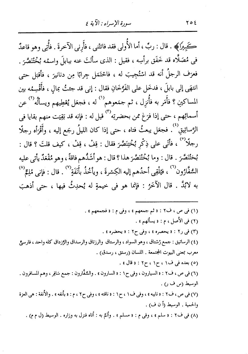 كبيرا} ، قال : يا رب أما الأولى فقد فاتتني فأرني الآخرة ، فأتى وهو قاعد في مصلاه قد خفق برأسه فقيل : الذي سألت عنه ببابل واسمه بختنصر ، فعرف الرجل أنه قد استجيب له فاحتمل جرابا من دنانير فأقبل حتى انتهى إلى بابل فدخل على الفرخان فقال : إني قد جئت بمال فأقسمه بين المساكين ، فأمر به فأنزل فجمعوهم له ثم جعل يعطيهم ويسألهم عن أسمائهم حتى إذا فرغ ممن بحضرته قيل له : فإنه قد بقيت منهم بقايا في الرساتيق فجعل يبعث فتاه حتى إذا كان الليل رجع إليه فأقرأه رجلا رجلا فأتى على ذكر بختنصر فقال : قف ، كيف قلت قال : بختنصر ، قال : وما بختنصر هذا قال : هو أشدهم فاقة وهو مقعد يأتي عليه السفارون فيلقي أحدهم إليه الكسرة ويأخذ بأنفه ، قال : فإني مسلم به لا بد ، قال الآخر : فإنما هو في خيمة له يحدث فيها حتى أذهب