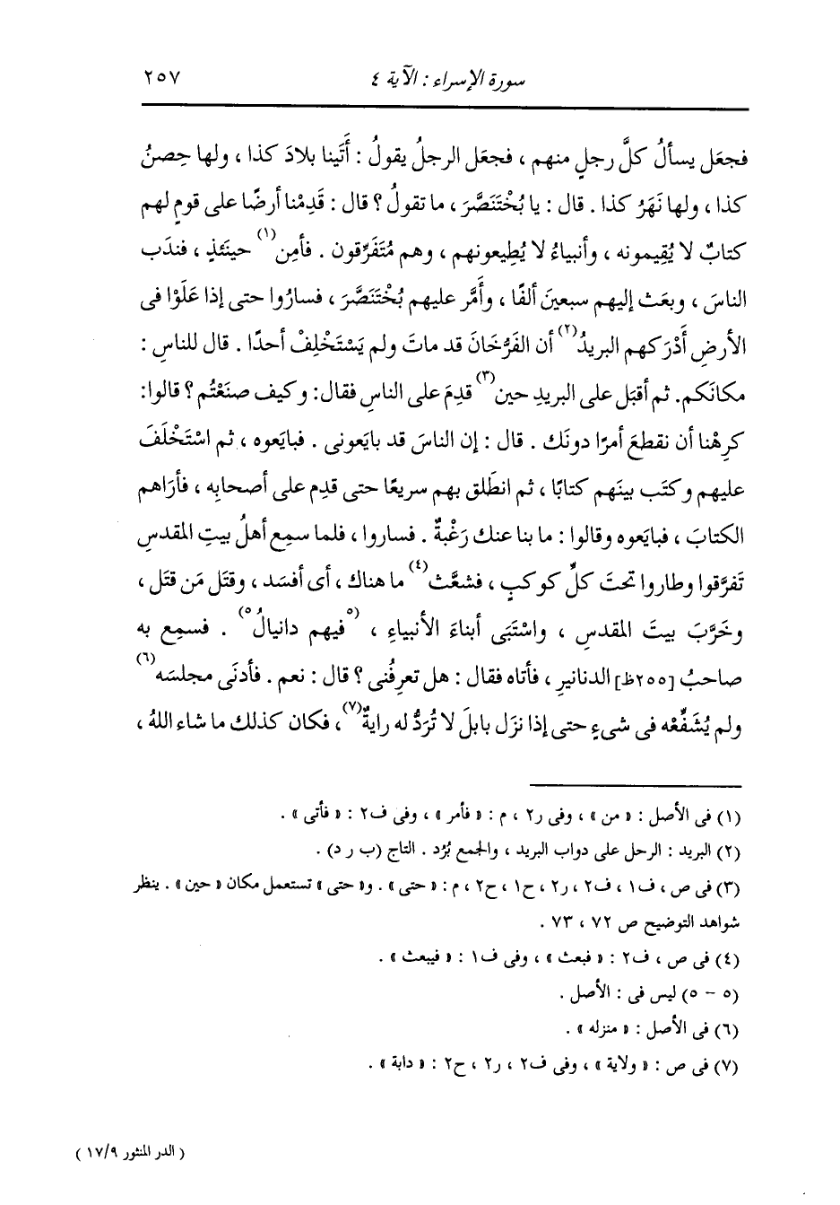 فجعل يسأل كل رجل منهم فجعل الرجل يقول : أتينا بلاد كذا ولها حصن كذا ولها نهر كذا قال : يا بختنصر ما تقول قال : قدمنا أرضا على قوم لهم كتاب لا يقيمونه وأنبياء لا يطيعونهم وهم متفرقون ، فأمر حينئذ فندب الناس وبعث إليهم سبعين ألفا وأمر عليهم بختنصر فساروا حتى إذا علوا في الأرض أدركهم البريد أن الفرخان قد مات ولم يستخلف أحدا ، قال للناس : مكانكم ، ثم أقبل على البريد حتى قدم على الناس وقال : كيف صنعتم قالوا : كرهنا أن نقطع أمرا دونك ، قال : إن الناس قد بايعوني ، فبايعوه ثم استخلف عليهم وكتب بينهم كتابا ثم انطلق بهم سريعا حتى قدم على أصحابه فأراهم الكتاب فبايعوه وقالوا : ما بنا رغبة عنك ، فساروا فلما سمع أهل بيت المقدس تفرقوا وطاروا تحت كل كوكب فشعث ما هناك أي أفسد وقتل من قتل وخرب بيت المقدس واستبى أبناء الأنبياء فيهم دانيال ، فسمع به صاحب الدنانير فأتاه فقال : هل تعرفني قال : نعم ، فأدنى مجلسه ولم يشفعه في شيء حتى إذا نزل بابل لا ترد له راية ، فكان كذلك ما شاء الله