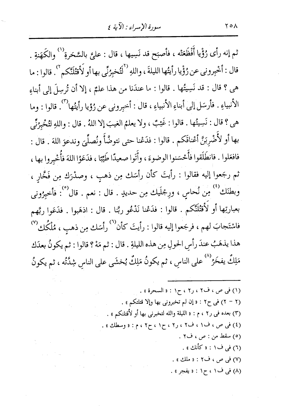 ثم إنه رأى رؤيا فأفظعته فأصبح قد نسيها ، قال : علي بالسحرة والكهنة ، قال : أخبروني عن رؤيا رأيتها الليلة والله لتخبرني بها أو لأقتلنكم ، قالوا : ما هي قال : قد نسيتها قالوا : ما عندنا من هذا علم إلا أن ترسل إلى أبناء الأنبياء ، فأرسل إلى أبناء الأنبياء ، قال : أخبروني عن رؤيا رأيتها الليلة والله لتخبروني بها أو لأقتلنكم ، قالوا : ما هي قال : قد نسيتها ، قالوا غيب ولا يعلم الغيب إلا الله تعالى ، قال والله لتخبرني بها أو لأضربن أعناقكم ، قالوا : فدعنا حتى نتوضأ ونصلي وندعو الله تعالى ، قال : فافعلوا ، فانطلقوا فأحسنوا الوضوء فأتوا صعيدا طيبا فدعوا الله فأخبروا بها ثم رجعوا إليه فقالوا : رأيت كأن رأسك من ذهب وصدرك من فخار ووسطك من نحاس ورجليك من حديد ، قال : نعم ، قال : أخبروني بعبارتها أو لأقتلنكم ، قالوا : فدعنا ندعو ربنا ، قال اذهبوا فدعوا ربهم فاستجاب لهم فرجعوا إليه قالوا : رأيت كأن رأسك من ذهب ملكك هذا يذهب عند رأس الحول من هذه الليلة ، قال : ثم مه قالوا : ثم يكون بعدك ملك يفخر على الناس ثم يكون ملك يخشى الناس شدته ثم يكون