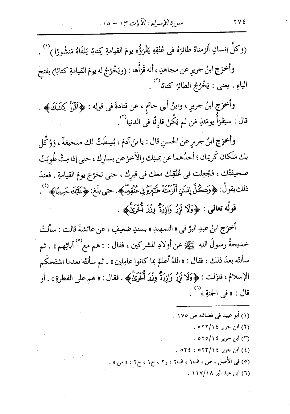 وأخرج ابن عبد البر في التمهيد بسند ضعيف عن عائشة رضي الله عنها قال : سالت خديجة رسول الله صلى الله عليه وسلم عن أولاد المشركين فقال : هم مع آبائهم ثم سألته بعد ذلك فقال : الله أعلم بما كانوا عاملين ثم سألته بعد ما استحكم الإسلام فنزلت {ولا تزر وازرة وزر أخرى} فقال : هم على الفطرة أو قال : في الجنة.