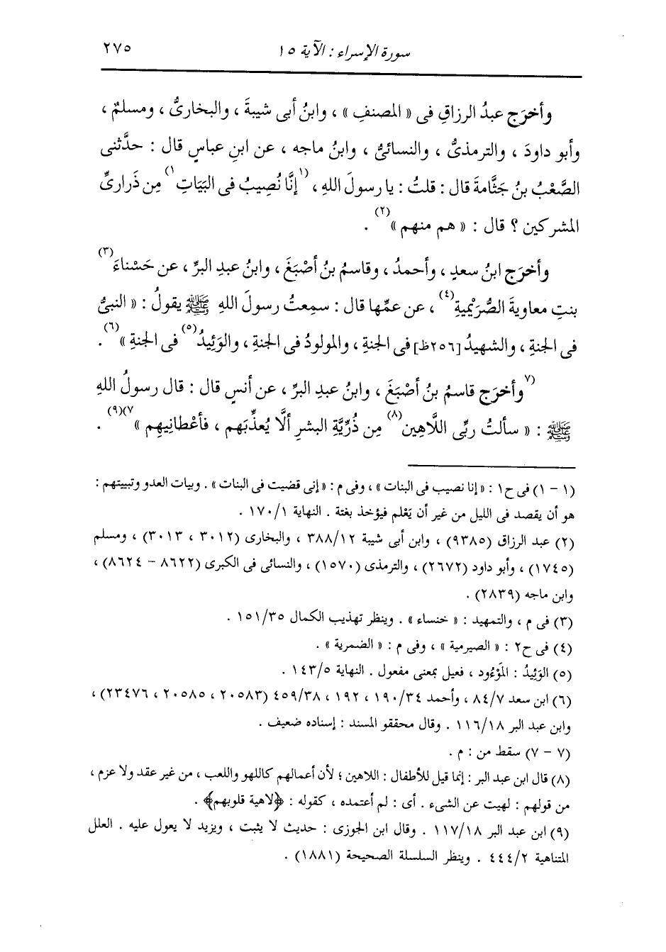 وأخرج عبد الرزاق في المصنف ، وَابن أبي شيبة والبخاري ومسلم وأبو داود والترمذي والنسائي ، وَابن ماجه عن ابن عباس رضي الله عنهما قال : حدثني الصعب بن جثامة رضي الله عنه قال : قلت يا رسول الله إني قضيت في البنات من ذراري المشركين قال : هم منهم.