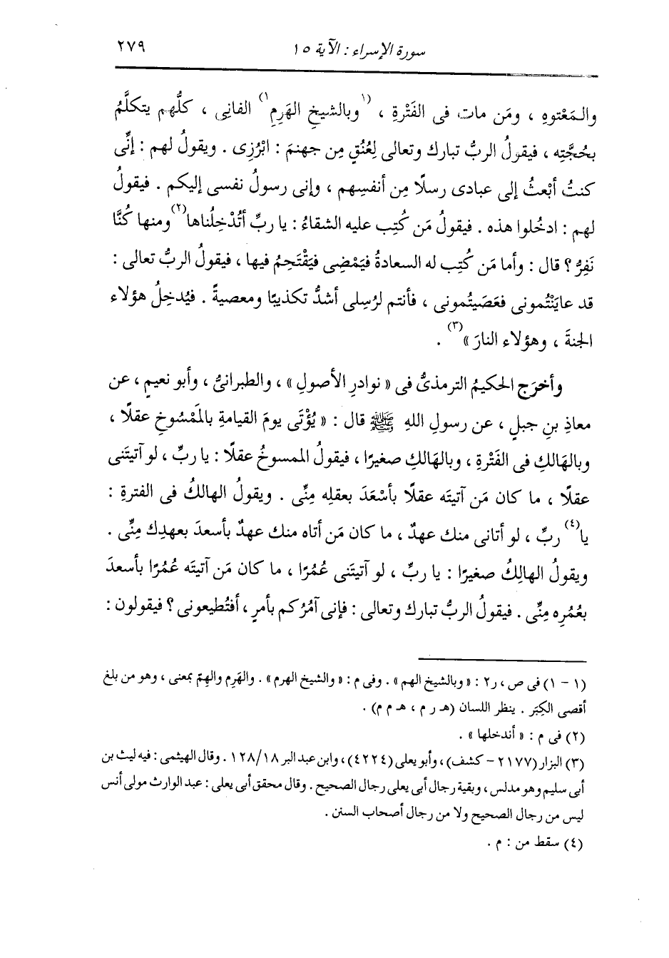 وأخرج الحكيم الترمذي في نوادر الأصول والطبراني وأبو نعيم عن معاذ بن جبل رضي الله عنه عن رسول الله صلى الله عليه وسلم قال : يؤتى يوم القيامة بالممسوخ عقلا وبالهالك في الفترة وبالهالك صغيرا فيقول الممسوخ عقلا : يا رب لو آتيتني عقلا ما كان من آتيته عقلا بأسعد بعقله مني ويقول الهالك في الفترة رب لو أتاني منك عهد ما كان من أتاه منك عهد بأسعد بعهدك مني ويقول الهالك صغيرا : يا رب لو آتيتني عمرا ما كان من أتيته عمرا بأسعد بعمره مني فيقول الرب تبارك وتعالى : فإني آمركم بأمر تطيعوني فيقولون :