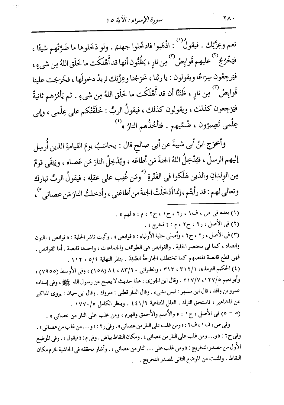 نعم وعزتك فيقول لهم : اذهبوا فادخلوا جهنم ولو دخلوها ما ضرتهم شيئا فخرج عليهم قوابص من نار يظنون أنها قد أهلكت ما خلق الله من شيء فيرجعون سراعا ويقولون : يا ربنا خرجنا وعزتك نريد دخولها فخرجت علينا قوابص من نار ظننا أن قد أهلكت ما خلق الله من شيء ثم يأمرهم ثانية فيرجعون كذلك ويقولون : كذلك فيقول الرب : خلقتكم على علمي وإلى علمي تصيرون ضميهم فتأخذهم النار.
