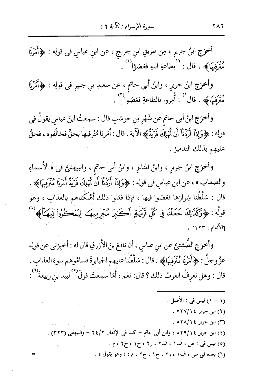 وأخرج ابن جرير ، وَابن المنذر ، وَابن أبي حاتم والبيهقي في الأسماء والصفات عن ابن عباس رضي الله عنهما في قوله : {وإذا أردنا أن نهلك قرية أمرنا مترفيها} قال : سلطنا شرارها فعصوا فيها فإذا فعلوا ذلك أهلكناهم بالعذاب ، وهو قوله : {وكذلك جعلنا في كل قرية أكابر مجرميها ليمكروا فيها} الأنعام آية 123.