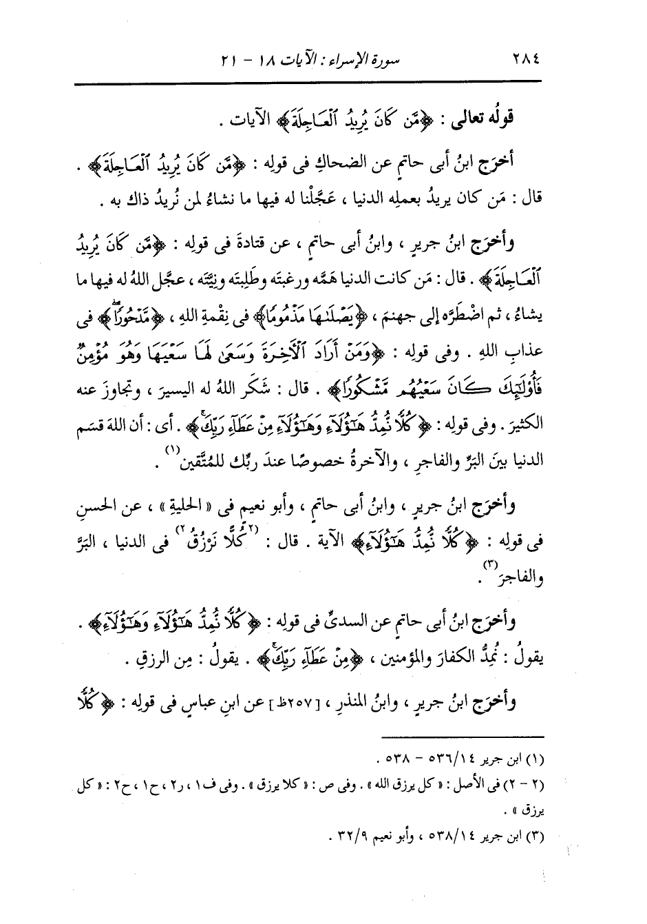 وأخرج ابن جرير ، وَابن أبي حاتم وأبو نعيم في الحلية عن الحسن رضي الله عنه في قوله : {كلا نمد} الآية ، قال : كلا نرزق في الدنيا البر والفاجر.