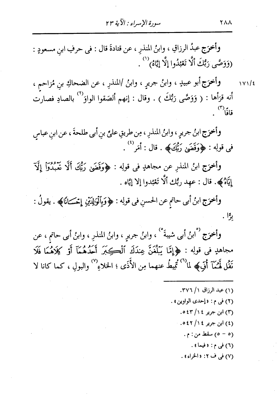 وأخرج عبد الرزاق ، وَابن المنذر عن قتادة قال : في حرف ابن مسعود رضي الله عنه ووصى ربك أن لا تعبدوا إلا إياه.