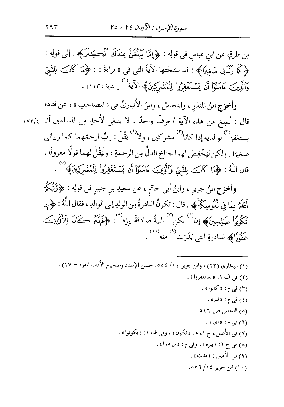 من طرق عن ابن عباس رضي الله عنهما في قوله : {إما يبلغن عندك الكبر} إلى قوله : {كما ربياني صغيرا} قد نسختها الآية التي في براءة (ما كان للنبي والذين آمنوا أن يستغفروا للمشركين) (التوبة آية 113) الآية.