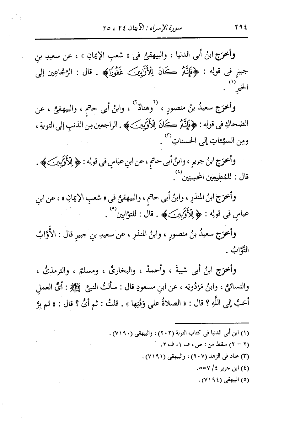 وأخرج ابن أبي الدنيا والبيهقي في شعب الإيمان عن سعيد بن جبير رضي الله عنه في قوله : {فإنه كان للأوابين} قال : الرجاعين من الذنب إلى التوبة ومن السيئات إلى الحسنات.