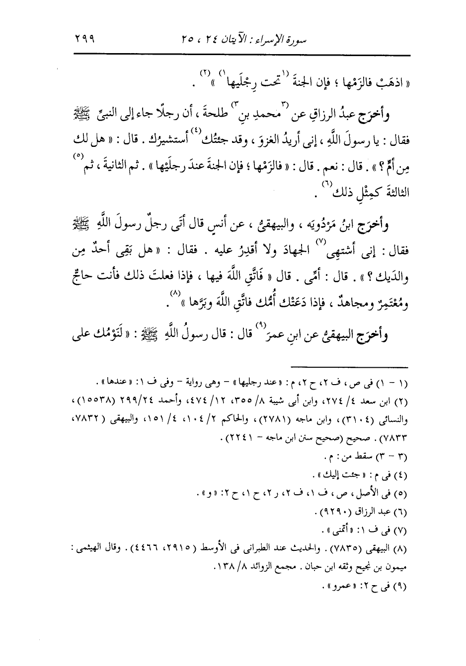 وأخرج عبد الرزاق عن طلحة رضي الله عنه أن رجلا جاء إلى النَّبِيّ صلى الله عليه وسلم فقال : يا رسول الله إني أريد الغزو وقد جئت إليك أستشيرك فقال : هل لك من أم قال : نعم ، قال : فالزمها فإن الجنة عند رجليها ثم الثانية ثم الثالثة كمثل ذلك.