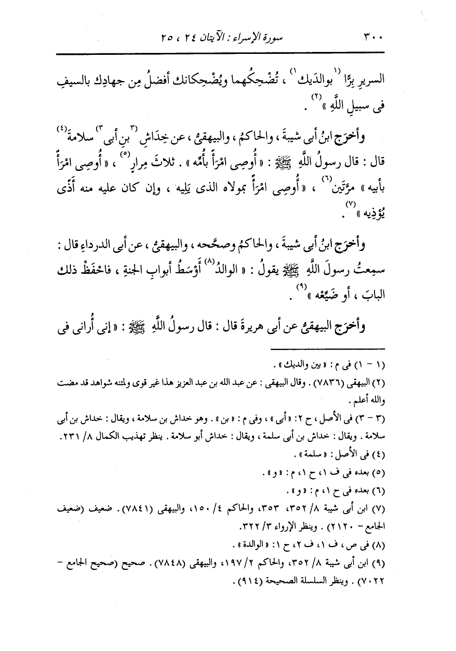 وأخرج ابن أبي شيبة والحاكم والبيهقي عن خداش بن سلامة قال : قال رسول الله صلى الله عليه وسلم أوصي امرأ بأمه ثلاث مرار وأوصي امرأ بأبيه مرتين وأوصي امرأ بمولاه الذي يليه وإن كان عليه منه أذى يؤذيه.