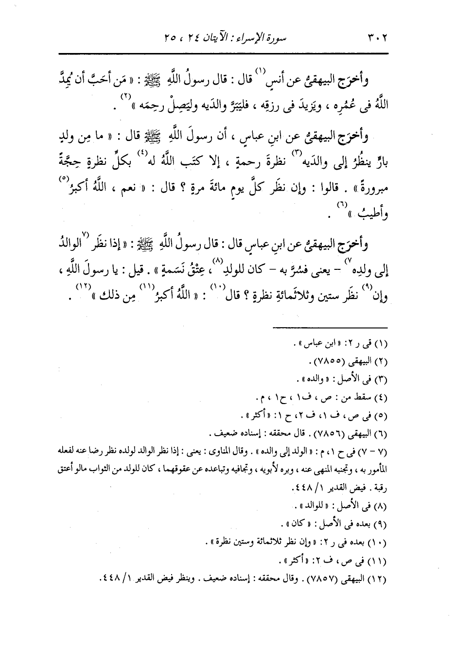 وأخرج البيهقي عن ابن عباس - رضي الله عنهما - قال : قال رسول الله صلى الله عليه وسلم إذا نظر الولد إلى والده - يعني - فسر به كان للولد عتق نسمة قيل : يا رسول الله وإن نظر ثلاثمائة وستين نظرة قال : الله أكبر من ذلك.