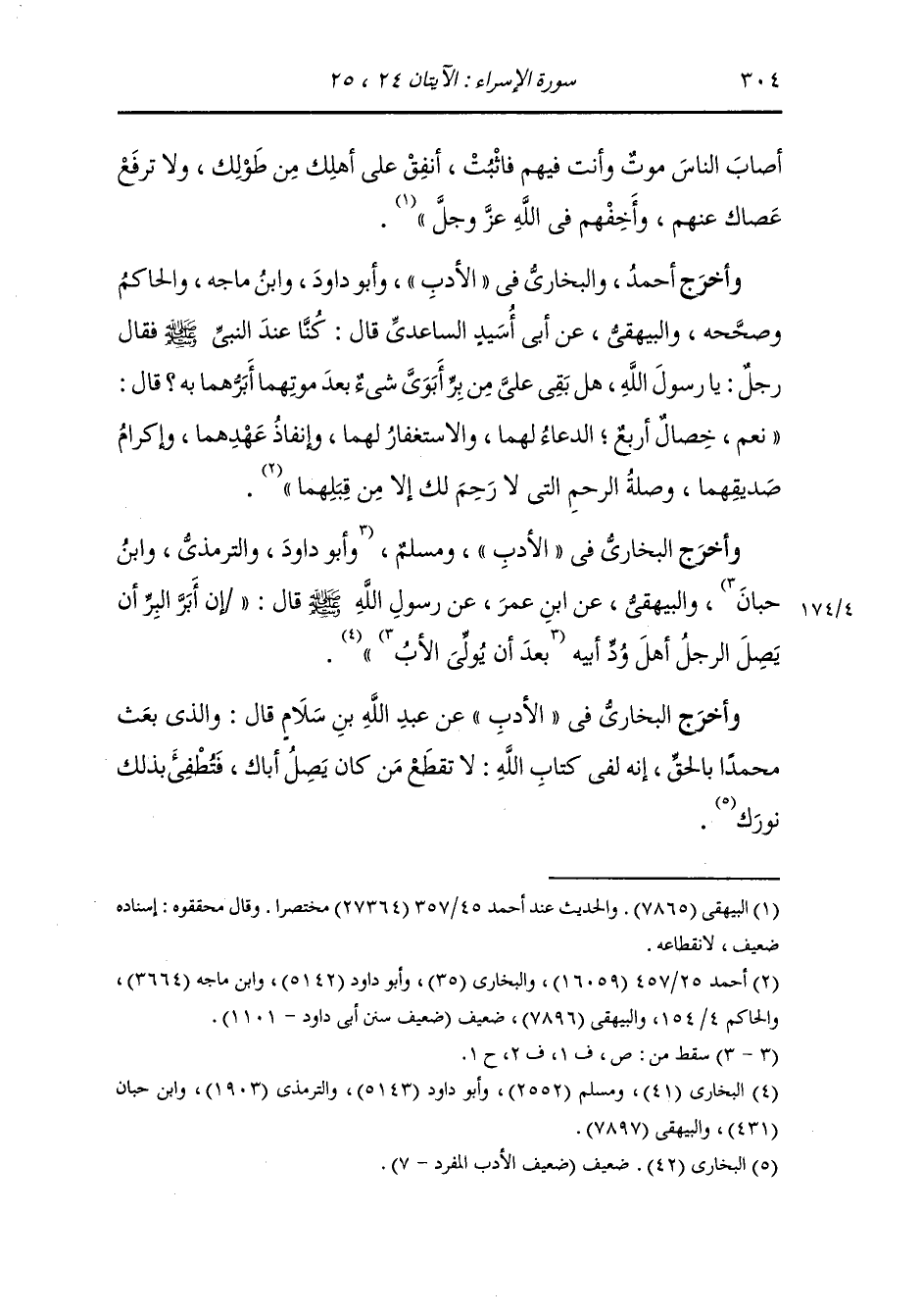 وأخرج البخاري في الأدب عن عبد الله بن سلام - رضي الله عنه - قال : والذي بعث محمد بالحق إنه لفي كتاب الله لا تقطع من كان يصل أباك فتطفئ بذلك نورك.