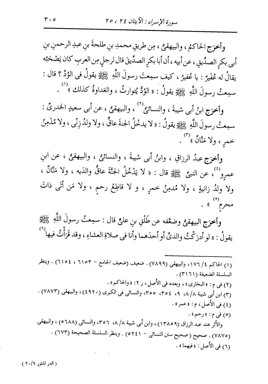 وأخرج عبد الرزاق ، وَابن أبي شيبة والنسائي والبيهقي عن ابن عمر رضي الله عنهما عن النَّبِيّ صلى الله عليه وسلم قال : لا يدخل الجنة عاق والديه ولا منان ولا ولد زنية ولا مدمن خمر ولا قاطع رحم ولا من أتى ذات رحم.