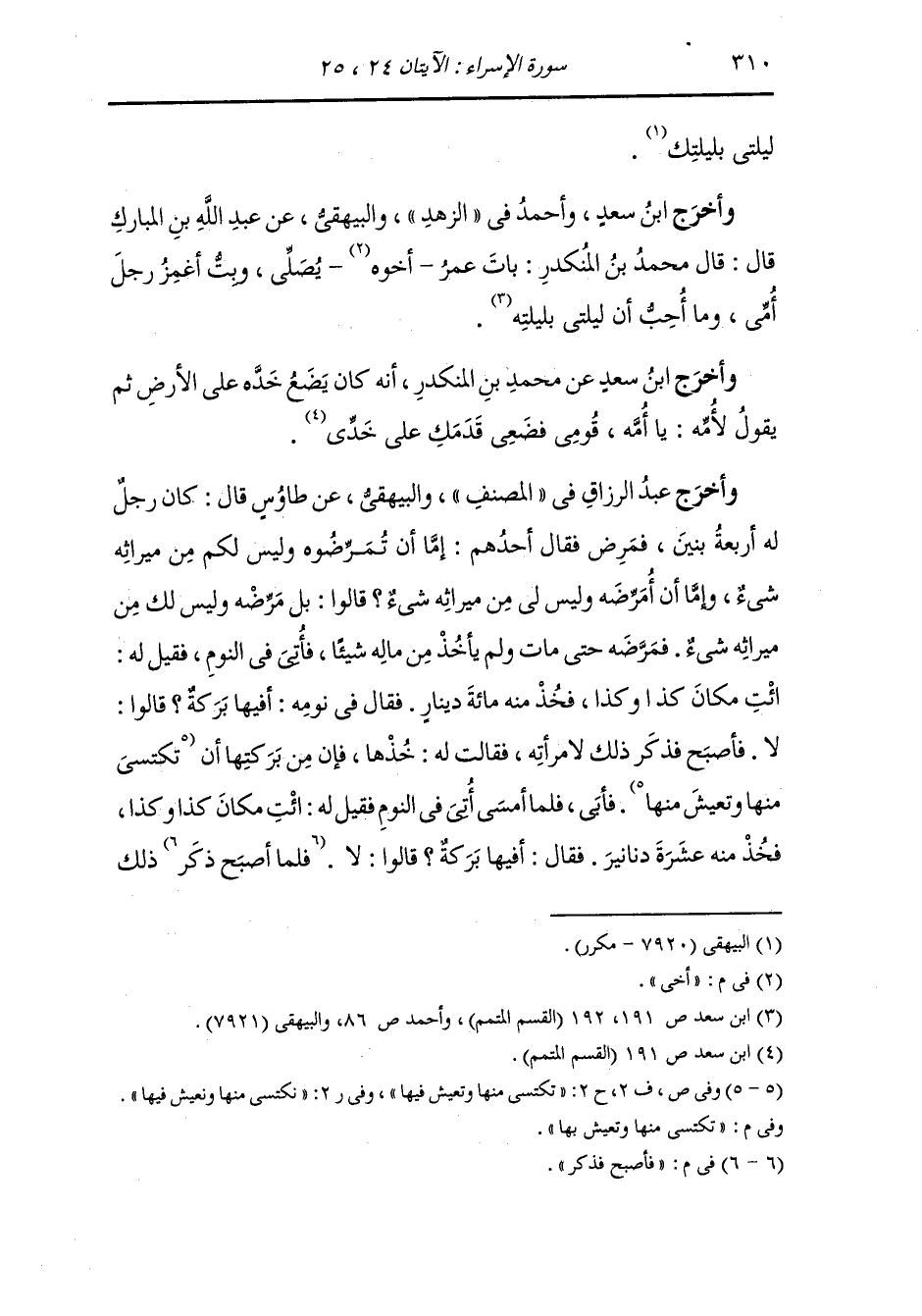 وأخرج عبد الرزاق في المصنف والبيهقي ، عَن طاووس قال : كان رجل له أربعة بنين فمرض فقال أحدهم : إما أن تمرضوه وليس لكم من ميراثه شيء وأما أن أمرضه وليس لي من ميراثه شيء قالوا : بل مرضه وليس لك من ميراثه شيء فمرضه فمات ولم يأخذ من ماله شيئا فأتي في النوم فقيل له : ائت مكان كذا وكذا فخذ منه مائة دينار فقال في نومه أفيها بركة قالوا : لا ، فأصبح فذكر ذلك لامرأته فقالت له خذها فإن من بركتها : أن تكتسي منها وتعيش بها فأبى فلما أمسى أتي في النوم فقيل له : ائت مكان كذا وكذا فخذ منه عشرة دنانير فقال : فيها بركة قالوا : لا فأصبح فذكر ذلك