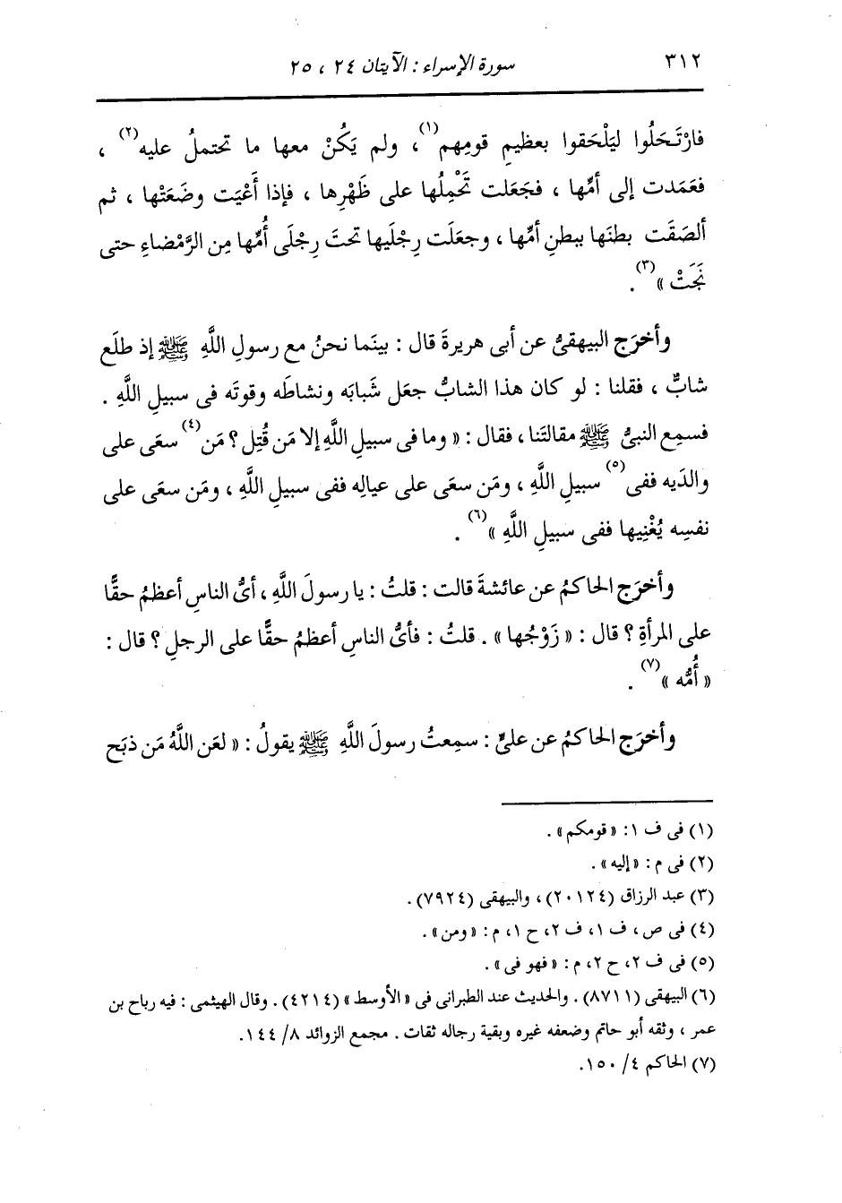 وأخرج البيهقي عن أبي هريرة رضي الله عنه قال : بينما نحن مع رسول الله صلى الله عليه وسلم إذ طلع شاب فقلنا : لو كان هذا الشاب جعل شبابه ونشاطه وقوته في سبيل الله فسمع النَّبِيّ صلى الله عليه وسلم مقالتنا ، فقال : وما في سبيل الله إلا من قتل ومن سعى على والديه فهو في سبيل الله ومن سعى على عياله فهو في سبيل الله ومن سعى على نفسه يغنيها فهو في سبيل الله تعالى.