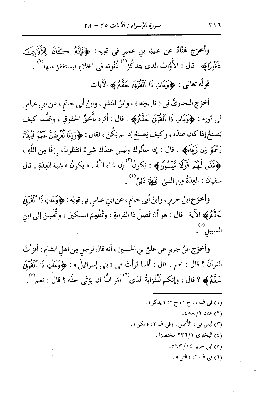وأخرج ابن جرير ، وَابن أبي حاتم عن ابن عباس رضي الله عنهما في قوله : {وآت ذا القربى حقه} الآية ، قال : هو أن تصل ذا القرابة وتطعم المسكين وتحسن إلى ابن السبيل.