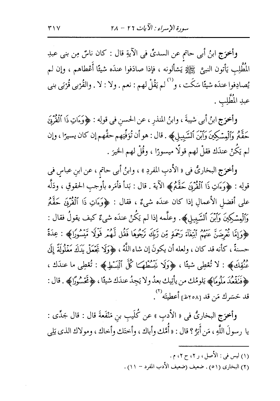 وأخرج البخاري في الأدب المفرد ، وَابن أبي حاتم عن ابن عباس رضي الله عنهما في قوله : {وآت ذا القربى حقه} الآية ، قال : بدأ فأمره بأوجب الحقوق ودله على أفضل الأعمال إذا كان عنده شيء ، فقال : {وآت ذا القربى حقه والمسكين ، وَابن السبيل} وعلمه إذا لم يكن عنده شيء كيف يقول ، فقال : {وإما تعرضن عنهم ابتغاء رحمة من ربك ترجوها فقل لهم قولا ميسورا} عدة حسنة كأته قد كان ولعله أن يكون إن شاء الله {ولا تجعل يدك مغلولة إلى عنقك} لا تعطي شيئا {ولا تبسطها كل البسط} تعطي ما عندك {فتقعد ملوما} يلومك من يأتيك بعد ولا يجد عندك شيئا {محسورا} قال : قد حسرك من قد أعطيته.