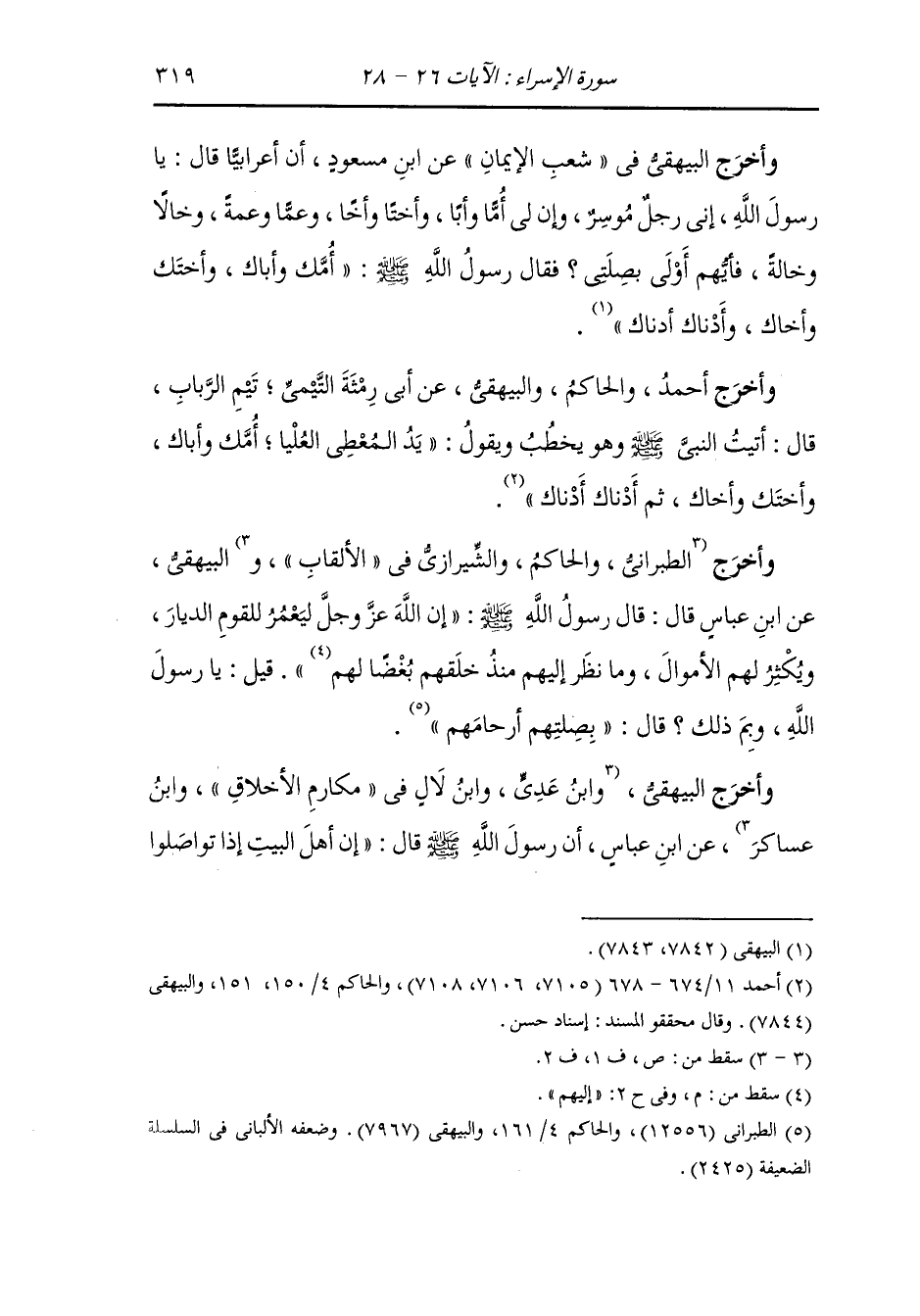 وأخرج البيهقي في شعب الإيمان عن ابن مسعود رضي الله عنه أن أعرابيا قال : يا رسول الله إني رجل موسر وإن لي أما وأبا وأختا وأخا وعما وعمة وخالا وخالة فأيهم أولى بصلتي قال رسول الله صلى الله عليه وسلم : أمك وأباك وأختك وأخاك وأدناك أدناك.