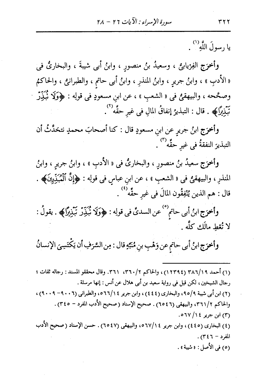 وأخرج ابن جرير عن ابن مسعود رضي الله عنه قال : كنا أصحاب محمد نتحدث أن التبذير النفقة في غير حقه.