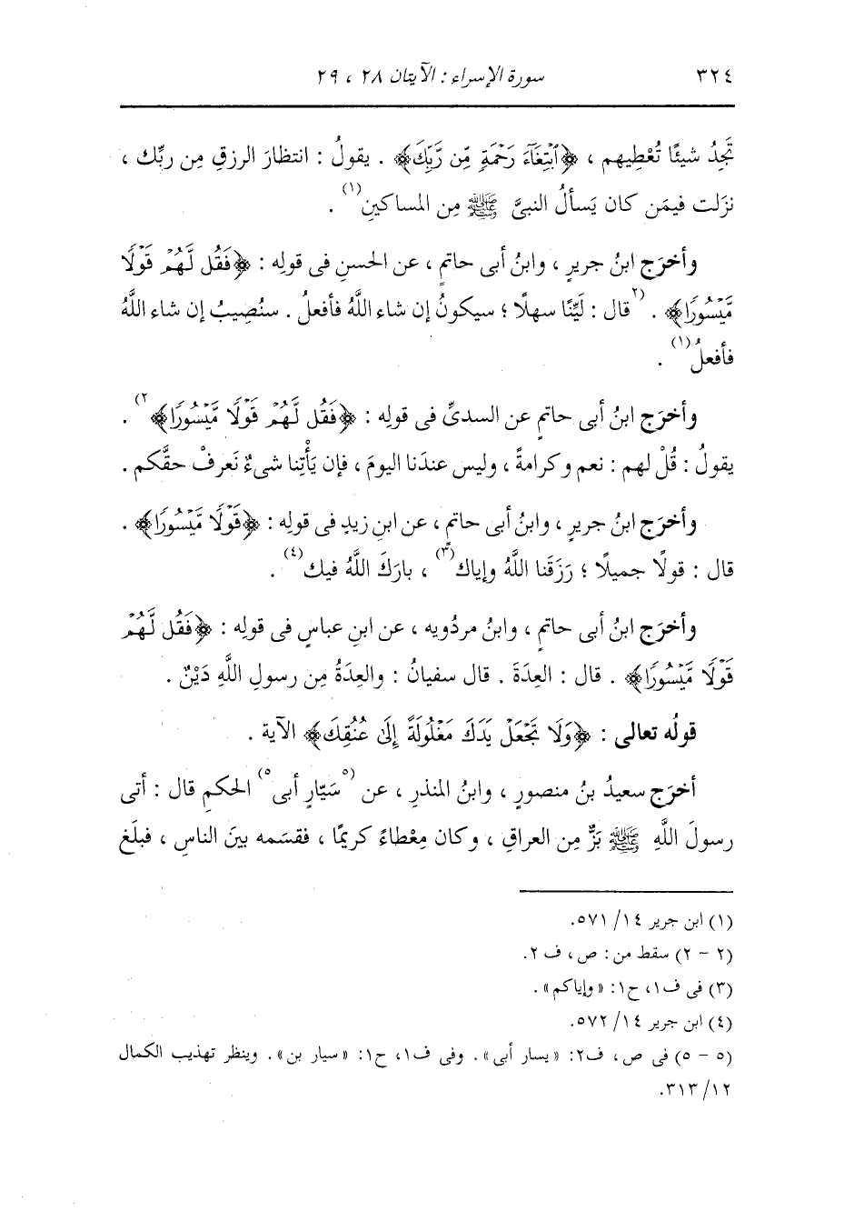 وأخرج ابن جرير ، وَابن أبي حاتم عن الحسن رضي الله عنه في قوله : {فقل لهم قولا ميسورا} قال : لينا سهلا سيكون إن شاء الله تعالى فأفعل سنصيب إن شاء الله فأفعل.