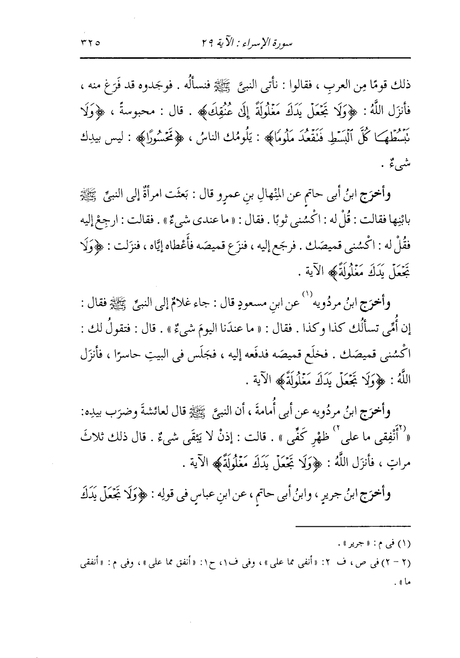 وأخرج ابن جرير عن ابن مسعود رضي الله عنه قال : جاء غلام إلى النَّبِيّ صلى الله عليه وسلم فقال : إن أمي تسألك كذا وكذا فقال : ما عندنا اليوم شيء قال : فتقول لك اكسني قميصك فخلع قميصه فدفع إليه فجلس في البيت حاسرا ، فأنزل الله {ولا تجعل يدك مغلولة} الآية.