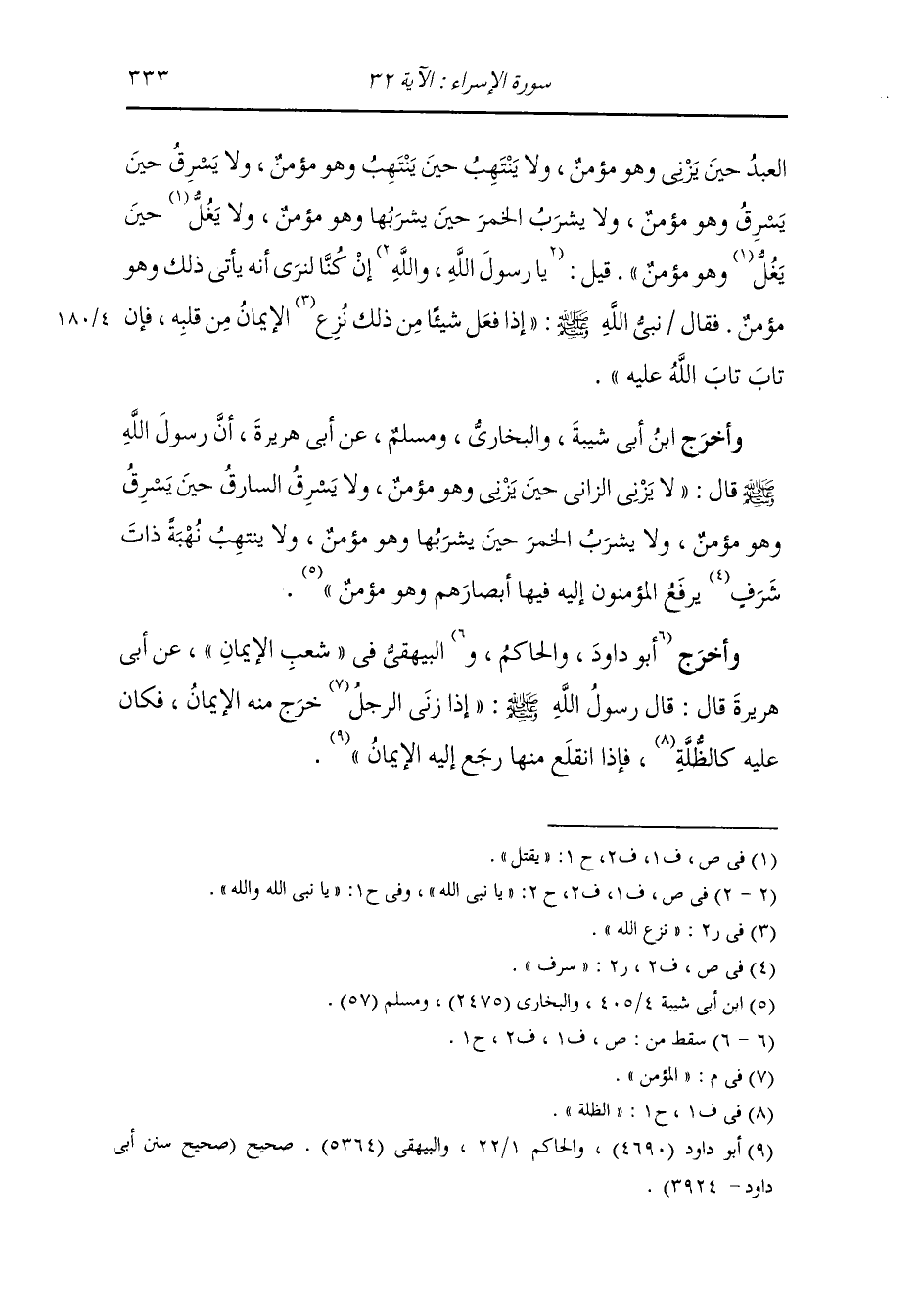وأخرج ابن أبي شيبة والبخاري ومسلم عن أبي هريرة رضي الله عنه أن رسول الله صلى الله عليه وسلم قال : لا يزني الزاني حين يزني وهو مؤمن ولا يسرق السارق حين يسرق وهو مؤمن ولا يشرب الخمر حين يشربها وهو مؤمن ولا ينتهب نهبة ذات شرف يرفع المؤمنون إليه فيها أبصارهم وهو مؤمن.