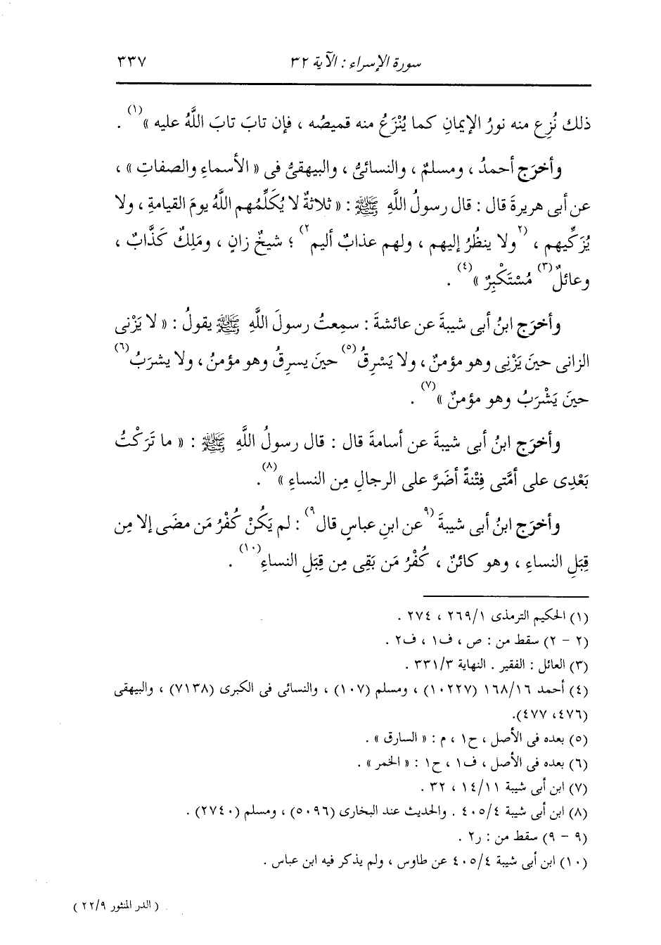 وأخرج ابن أبي شيبة عن عائشة رضي الله عنها : سمعت رسول الله صلى الله عليه وسلم يقول : لا يزني الزاني حين يزني وهو مؤمن ولا يسرق السارق حين يسرق وهو مؤمن ولا يشرب حين يشرب وهو مؤمن.