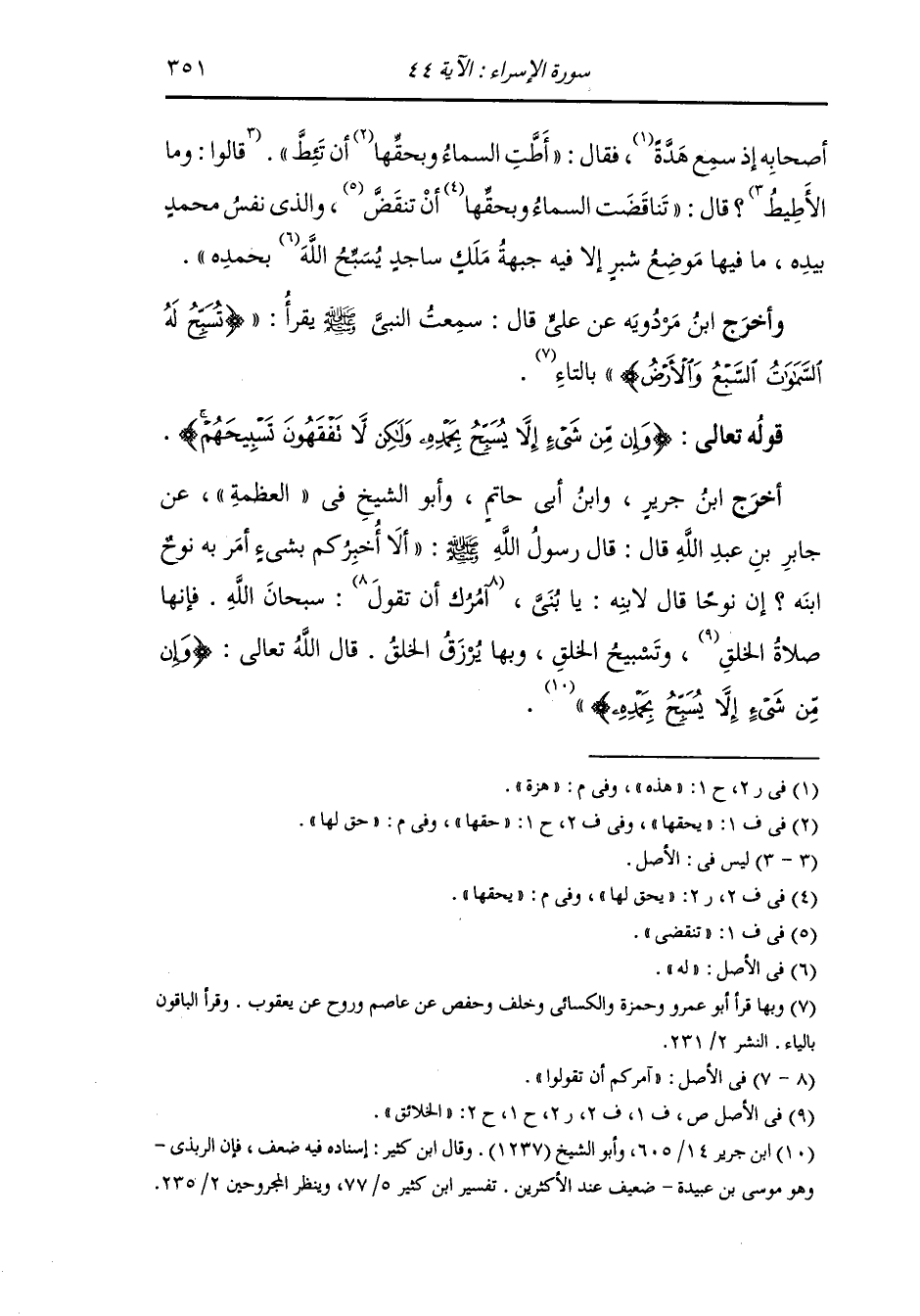 وأخرج ابن مردويه عن علي رضي الله عنه سمعت رسول الله صلى الله عليه وسلم يقرأ {تسبح له السماوات السبع والأرض} بالتاء ، قوله تعالى : {وإن من شيء إلا يسبح بحمده ولكن لا تفقهون تسبيحهم}.