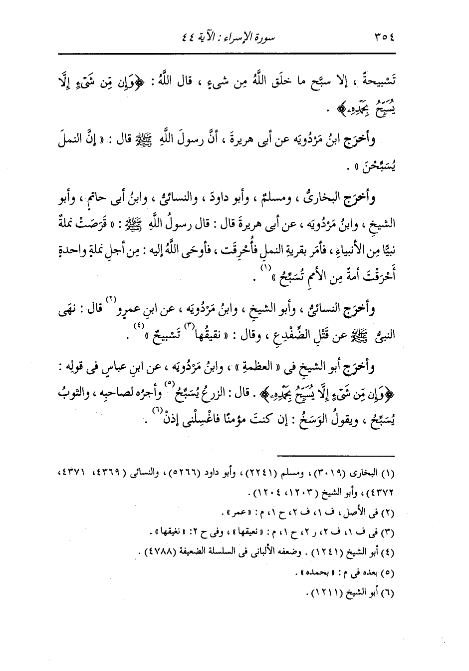 وأخرج البخاري ومسلم وأبو داود والنسائي ، وَابن أبي حاتم وأبو الشيخ ، وَابن مردويه عن أبي هريرة رضي الله عنه قال : قال رسول الله صلى الله عليه وسلم : قرصت نملة نبيا من الأنبياء فأمر بقرية النمل فأحرقت فأوحى الله إليه من أجل نملة واحدة أحرقت أمة من الأمم تسبح.