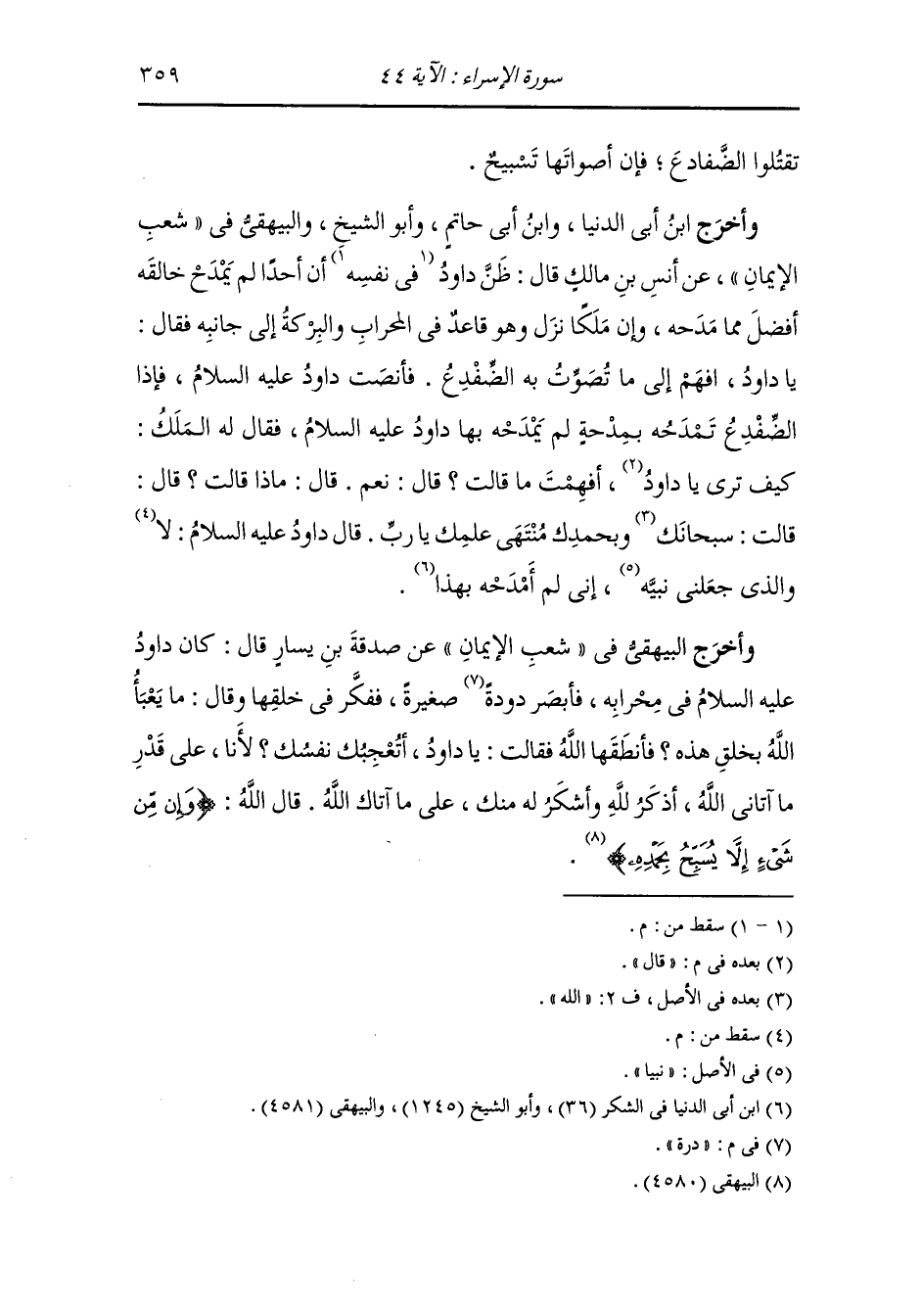 وأخرج البيهقي في شعب الإيمان عن صدقة بن يسار رضي الله عنه قال : كان داود عليه السلام في محرابه فأبصر درة صغيرة ففكر في خلقها وقال : ما يعبأ الله بخلق هذه فأنطقها الله فقالت : يا داود أتعجبك نفسك لأنا على قدر ما آتاني الله أذكر لله وأشكر له منك على ما آتاك الله ، قال الله : {وإن من شيء إلا يسبح بحمده}.