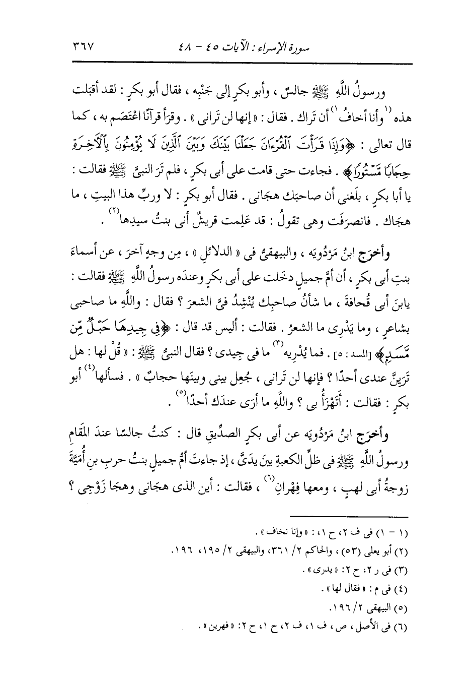 وأخرج ابن مردويه والبيهقي في الدلائل من وجه آخر عن أسماء بنت أبي بكر رضي الله عنهما : أن أم جميل دخلت على أبي بكر وعنده رسول الله صلى الله عليه وسلم فقالت : يا ابن أبي قحافة ما شأن صاحبك ينشد في الشعر فقال : والله ما صاحبي بشاعر وما يدري ما الشعر ، فقالت : أليس قد قال : (في جيدها حبل من مسد) (المسد آية 5) فما يدريه ما في جيدي فقال النَّبِيّ صلى الله عليه وسلم : قل لها : هل ترين عندي أحدا فإنها لن تراني جعل بيني وبينها حجاب فقال لها أبو بكر رضي الله عنه : فقالت : أتهزأ بي والله ما أرى عندك أحدا.