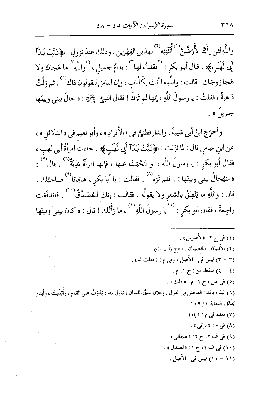 وأخرج ابن أبي شيبة والدارقطني في الأفراد وأبو نعيم في الدلائل عن ابن عباس رضي الله عنهما قال : لما نزلت (تبت يدا أبي لهب) جاءت امرأة أبي لهب فقال أبو بكر رضي الله عنه : يا رسول الله لو تنحيت عنها فإنها امرأة بذية فقال : إنه سيحال بيني وبينها فلا تراني فقال : يا أبا بكر هجانا صاحبك