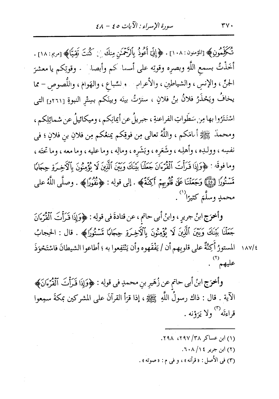 وأخرج ابن جرير ، وَابن أبي حاتم عن قتادة رضي الله عنه في قوله : {وإذا قرأت القرآن جعلنا بينك وبين الذين لا يؤمنون بالآخرة حجابا مستورا} قال : الحجاب المستور أكنة على قلوبهم أن يفقهوه وأن ينتفعوا به أطاعوا الشيطان فاستحوذ عليهم.