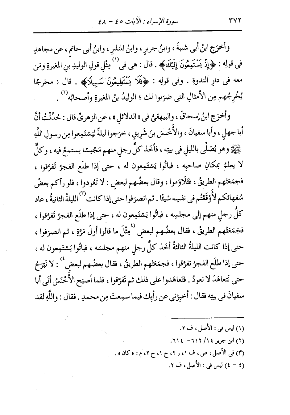 حدثت أن أبا جهل وأبا سفيان والأخنس بن شريق خرجوا ليلة يستمعون من رسول الله صلى الله عليه وسلم وهو يصلي بالليل في بيته فأخذ كل رجل منهم مجلسا يستمع فيه وكل لا يعلم بمكان صاحبه فباتوا يستمعون له حتى إذا طلع الفجر تفرقوا فجمعتهم الطريق فتلاوموا فقال بعضهم لبعض : لا تعودوا فلو رآكم بعض سفائكم لأوقعتم في نفسه شيئا ثم انصرفوا حتى إذا كان الليلة الثانية عاد كل رجل منهم إلى مجلسه فباتوا يستمعون له حتى طلع الفجر تفرقوا فجمعتهم الطريق فقال بعضهم لبعض : مثل ما قالوا أول مرة ثم انصرفوا حتى إذا كانت الليلة الثالثة أخذ كل واحد منهم مجلسه فباتوا يستمعون له حتى إذا طلع الفجر تفرقوا فجمعتهم الطريق فقال بعضهم لبعض : لا نبرح حتى نتعاهد لا نعود فتعاهدوا على ذلك ثم تفرقوا فلما أصبح الأخنس أتى أبا سفيان في بيته فقال : أخبرني عن رأيك فيما سمعت من محمد ، قال : والله لقد