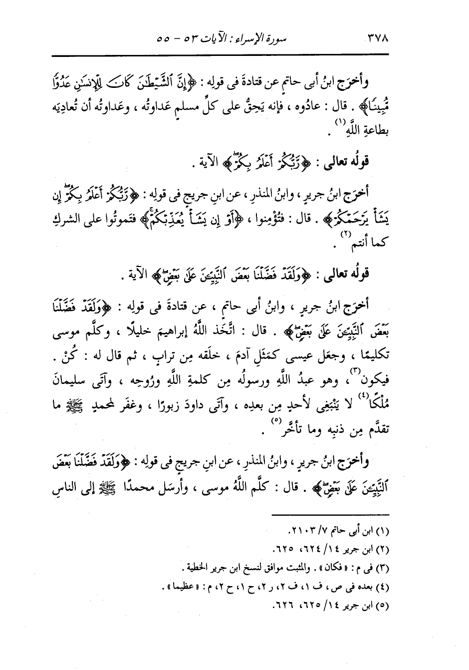 أَخْرَج ابن جرير ، وَابن أبي حاتم عن قتادة في قوله : {ولقد فضلنا بعض النبيين على بعض} قال : اتخذ الله إبراهيم خليلا وكلم موسى تكليما وجعل عيسى كمثل آدم خلقه من تراب ثم قال له كن فكان وهو عبد الله ورسوله من كلمة الله وروحه وآتى سليمان ملكا عظيما لا ينبغي لأحد من بعده وآتى داود زبورا وغفر لمحمد صلى الله عليه وسلم ما تقدم من ذنبه وما تأخر.