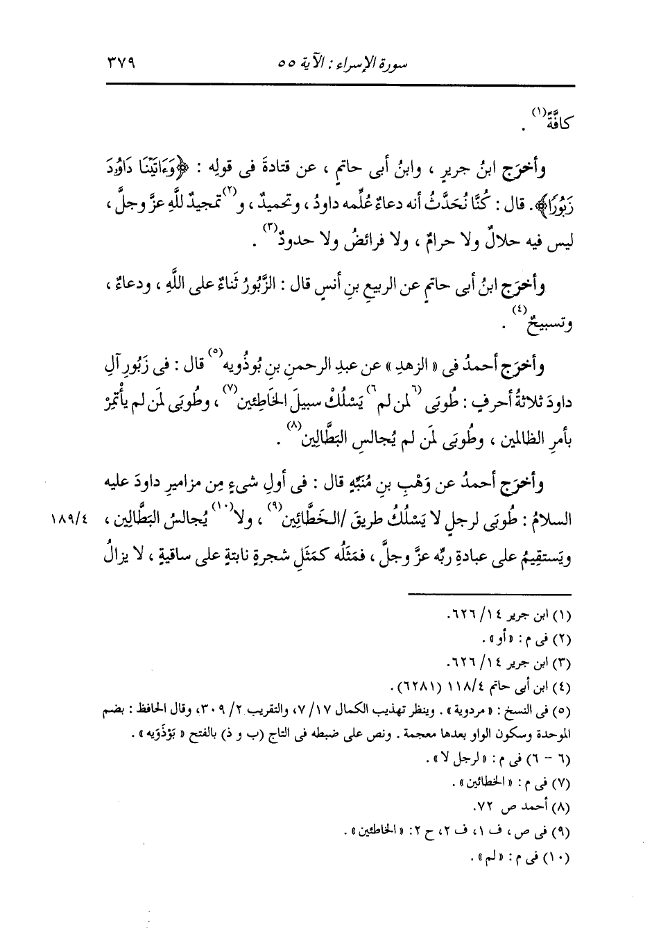 وأخرج ابن جرير ، وَابن أبي حاتم عن قتادة رضي الله عنه في قوله : {وآتينا داود زبورا} قال : كنا نحدث أنه دعاء علمه داود وتحميد أو تمجيد الله عز وجل ليس فيه حلال ولا حرام ولا فرائض ولا حدود.